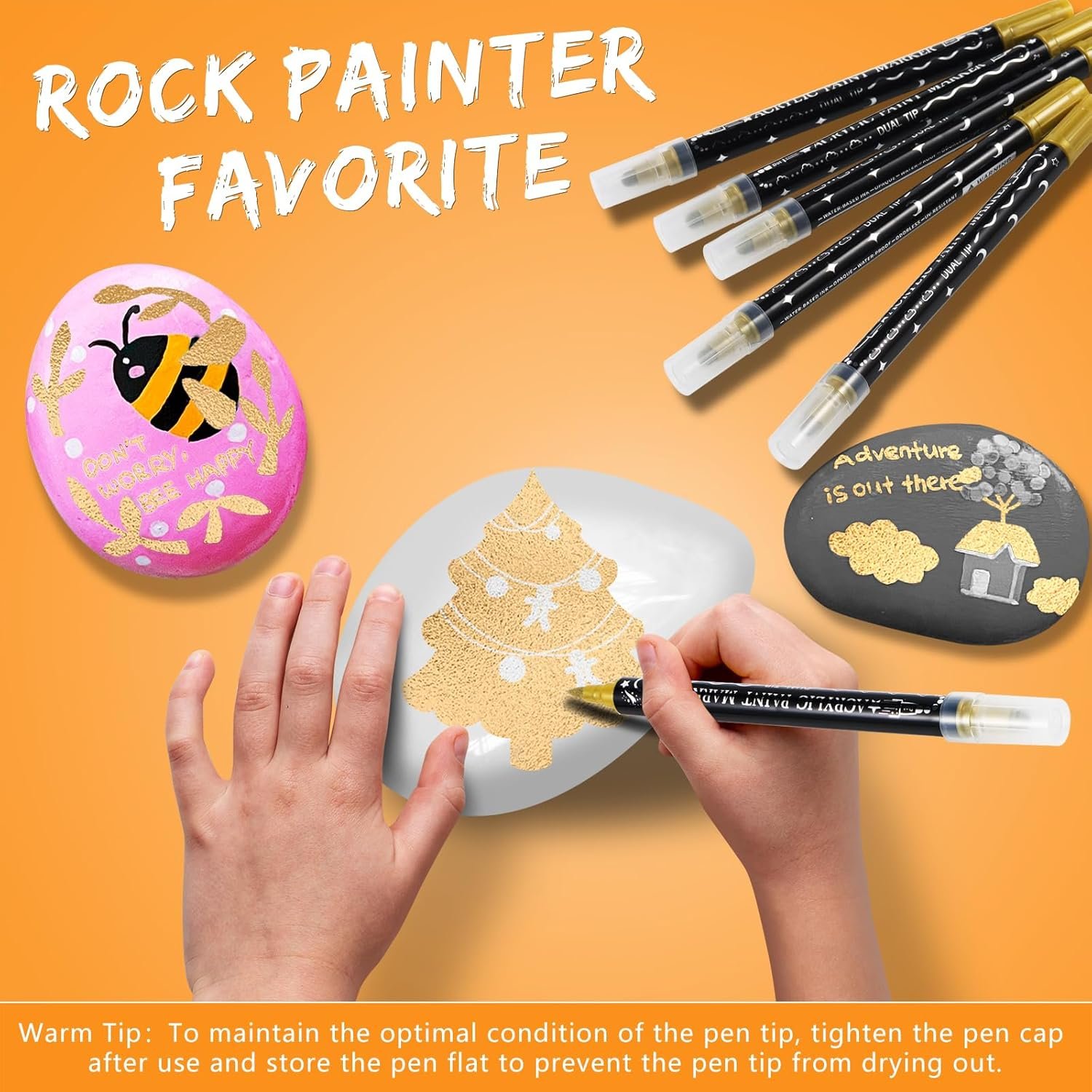 6 Gold Dual Tip White Acrylic Paint Markers: Each acrylic pen we use for stones is waterproof and comes with a 1-5mm brush tip and a 1mm fine tip. The fine tip is perfect for artistic work that requires fine control, while the brush tip is specifically designed for filling large areas and highlighting details. You can also use them for stippling to meet all creative needs, from fine to comprehensive, enabling seamless switching and enhancing creative efficiency and fun