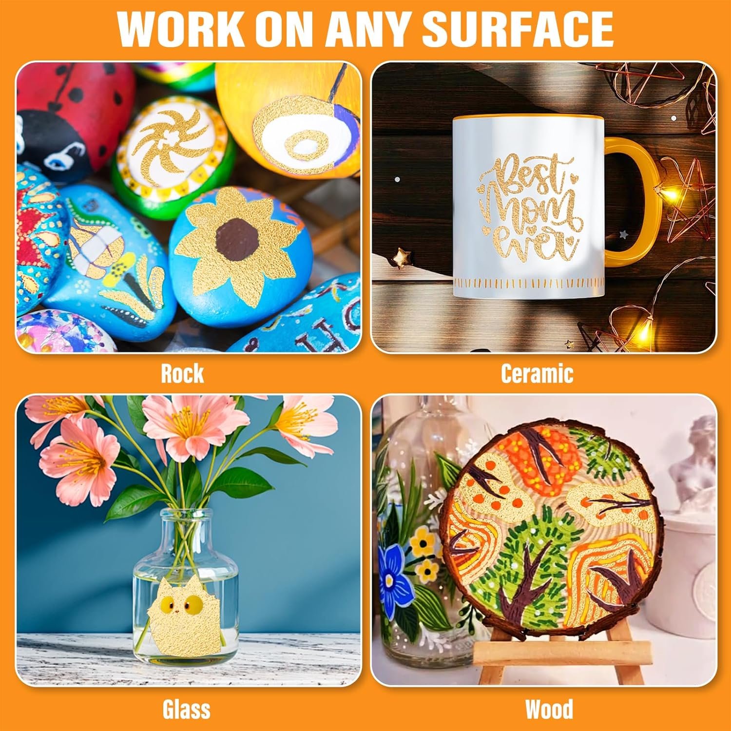 Vivid Gold: Our paint markers for drawing supplies only offer gold colors, especially when paired with dark backgrounds, as gold can highlight the rich colors of the artwork. They are perfect for drawing decorative lines, personalized carvings, as well as signing, greeting cards, billboards, or coloring model cars. They are also suitable for various surfaces, including stone, rock, ceramic, glass, jars, canvas shoes, fabric, backpacks, scrapbooking, metal, shells, wood, eggs, pumpkins, plastic, Christmas crafts, gift cards, and other craft supplies