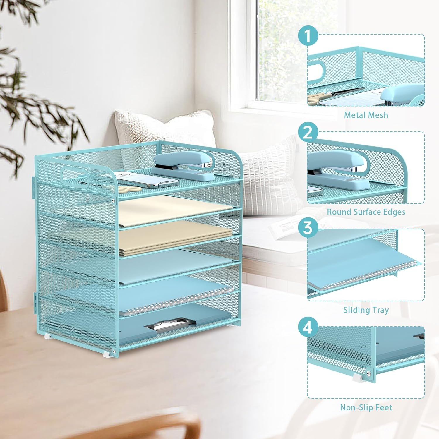 This desk organizer comes with 4 non-slip feet to secure the product and protect the table top, make this paper organizer more stable and bring you a better shopping experience.