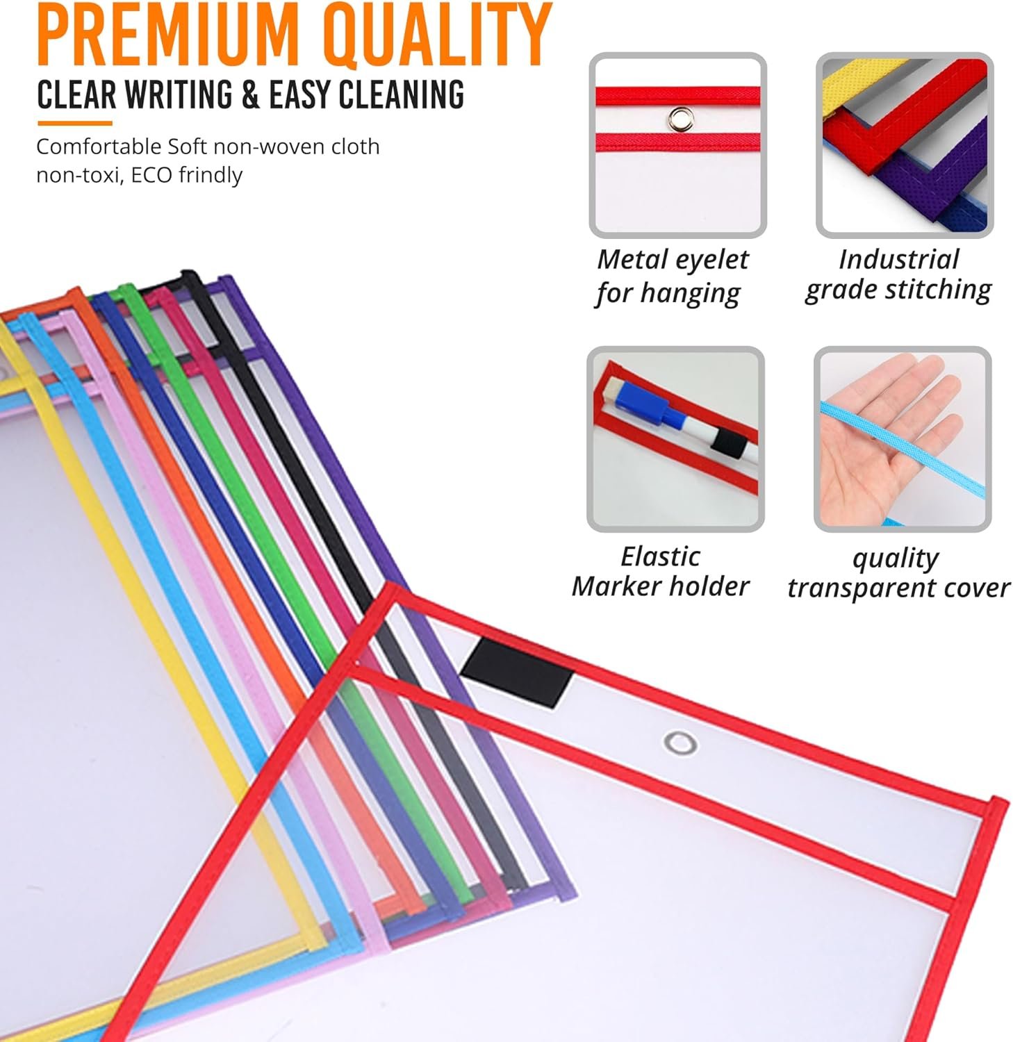 PREMIUM QUALITY MATERIALS: Our Dry Erase Pockets are made according to highest quality standard so that you can make the most of them. These Industrial grade stitched heavy duty hanging sleeves are made to withstand daily usage of classroom, office and work. This amazing combination of material guarantees maximum durability and peace of mind when you use our Dry Erase Pockets.