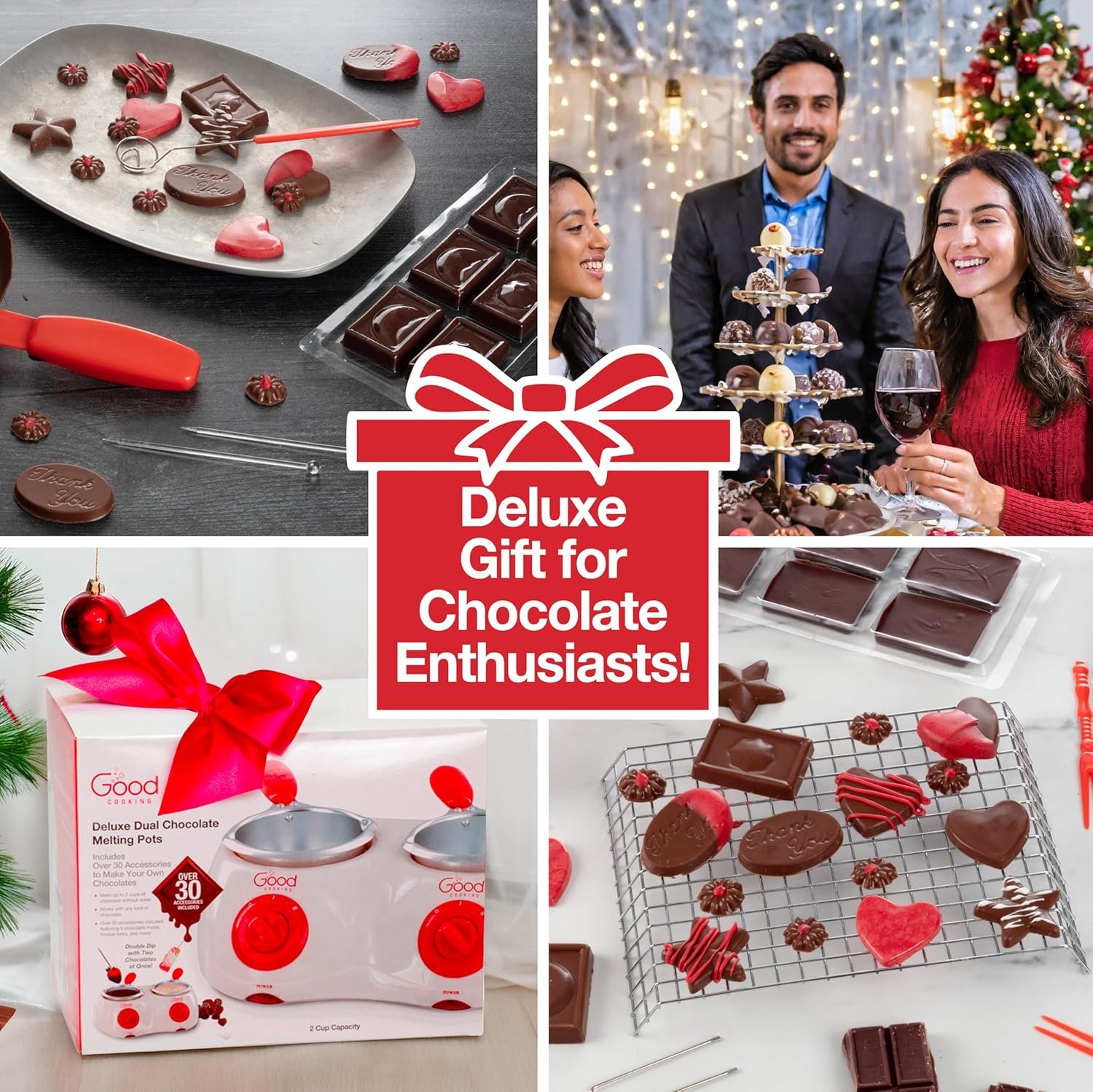 Electric Pot: Indulge with with Dual melting pots, including 7 chocolate molds, fondue forks, totaling over 30 accessories!