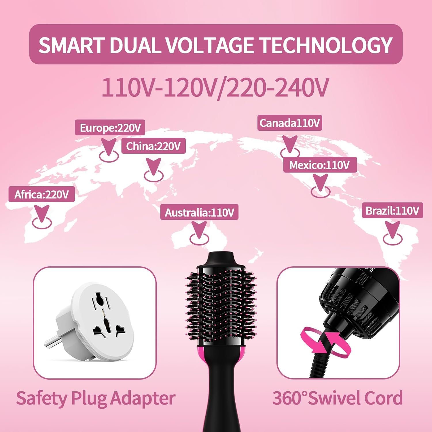 Innovative Dual Voltage Hair Dryer Brush: Our hair dryer brush features with Smart Voltage Technology, it will detect foreign voltage and adjust automatically, while still maintaining all of your heat and speed settings. Working range: USA (110V-120V, meets U.S. safety requirements standard UL.859), Europe (220-240V). Note: When use in Europe, please use the PLUG ADAPTER, NO NEED to use the VOLTAGE CONVERTER again