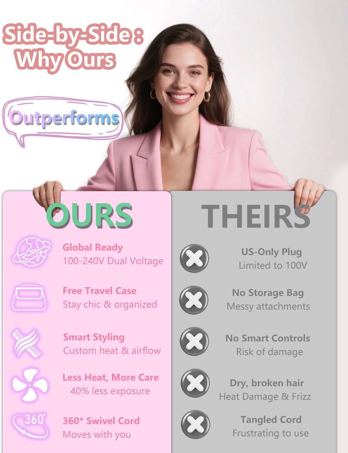 Multi Hair Styler, Travel Essential: The dual voltage hair styler combines a fast drying dryer, straightening brush, and volumizing styler into one compact tool. air hair curler saving you money, storage space, and time. Achieve salon-quality results effortlessly at home or business trips. Customizable nozzles adapt to all hair types and lengths , making it your ultimate all-in-one styling solution.