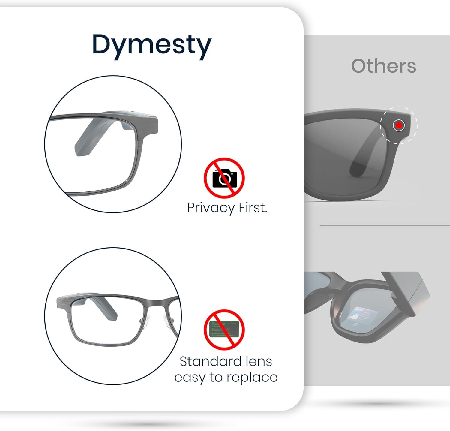 NO CAMERA, PRIVACY FIRST: Dymesty Smart AI glasses are intentionally designed without any cameras, embodying our Privacy-First principle. No privacy concerns—workplace friendly. For any questions, feel free to contact us anytime.