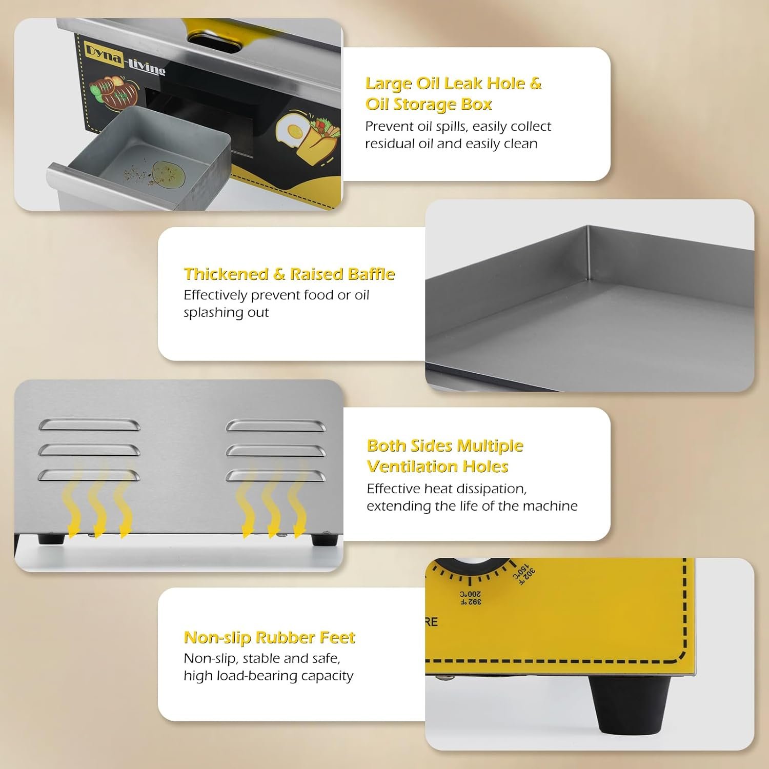 【Friendly-use Design】Multiple vents on both sides of the electric griddle, ensure effective heat dissipation that prolongs the service life of the electric griddle countertop. The non-slip rubber bottom makes the commercial electric griddle more stable; Splash guards on three sides prevent oil from splashing.