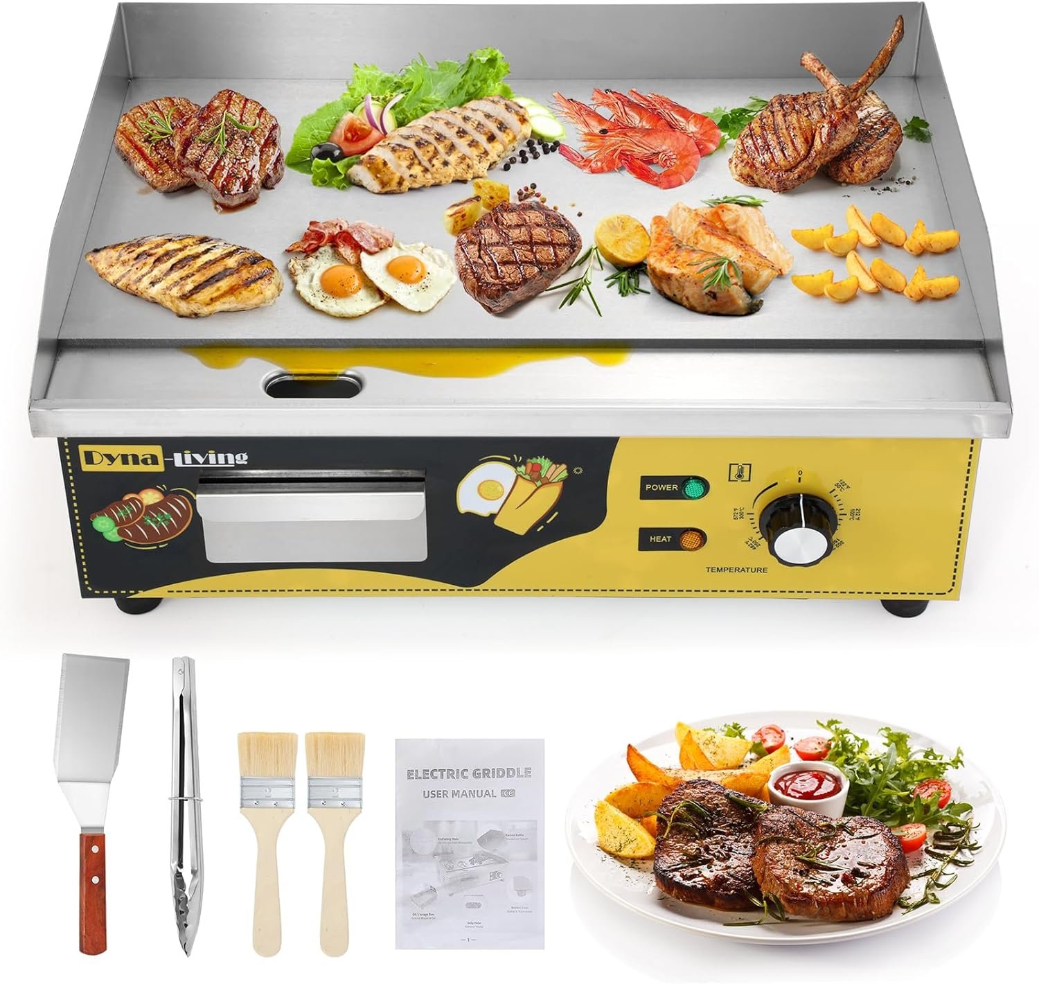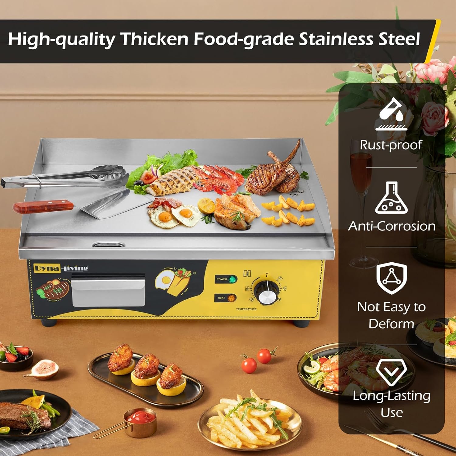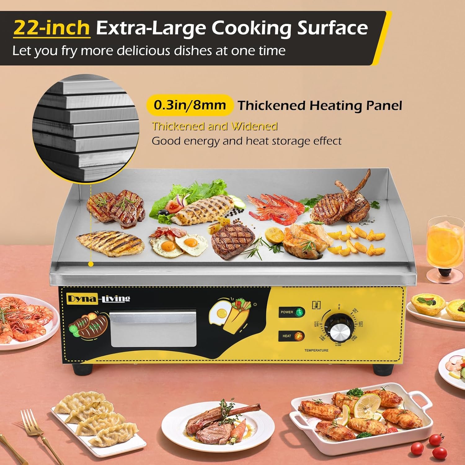【22-inch Commercial Electric Countertop Griddle】Dyna-Living stainless steel countertop grill made of high-quality thinckened stainless steel, 8mm thickened non-stick heating panel, electric flat top griddle cooking surface is 21.3 inch x 11.8 inch, extra-large cooking surface let you fry more delicious steak, chicken or other meat at the same time.
