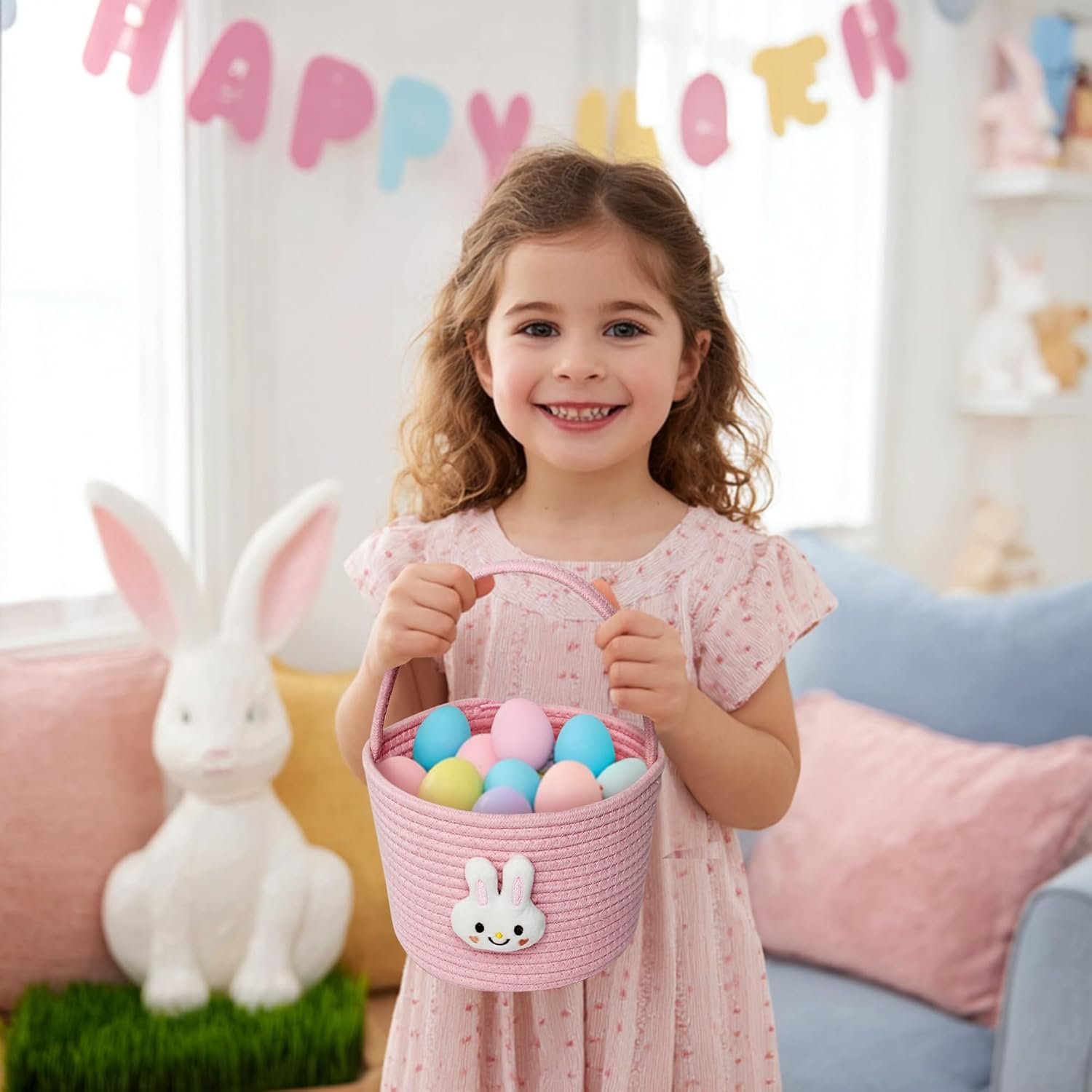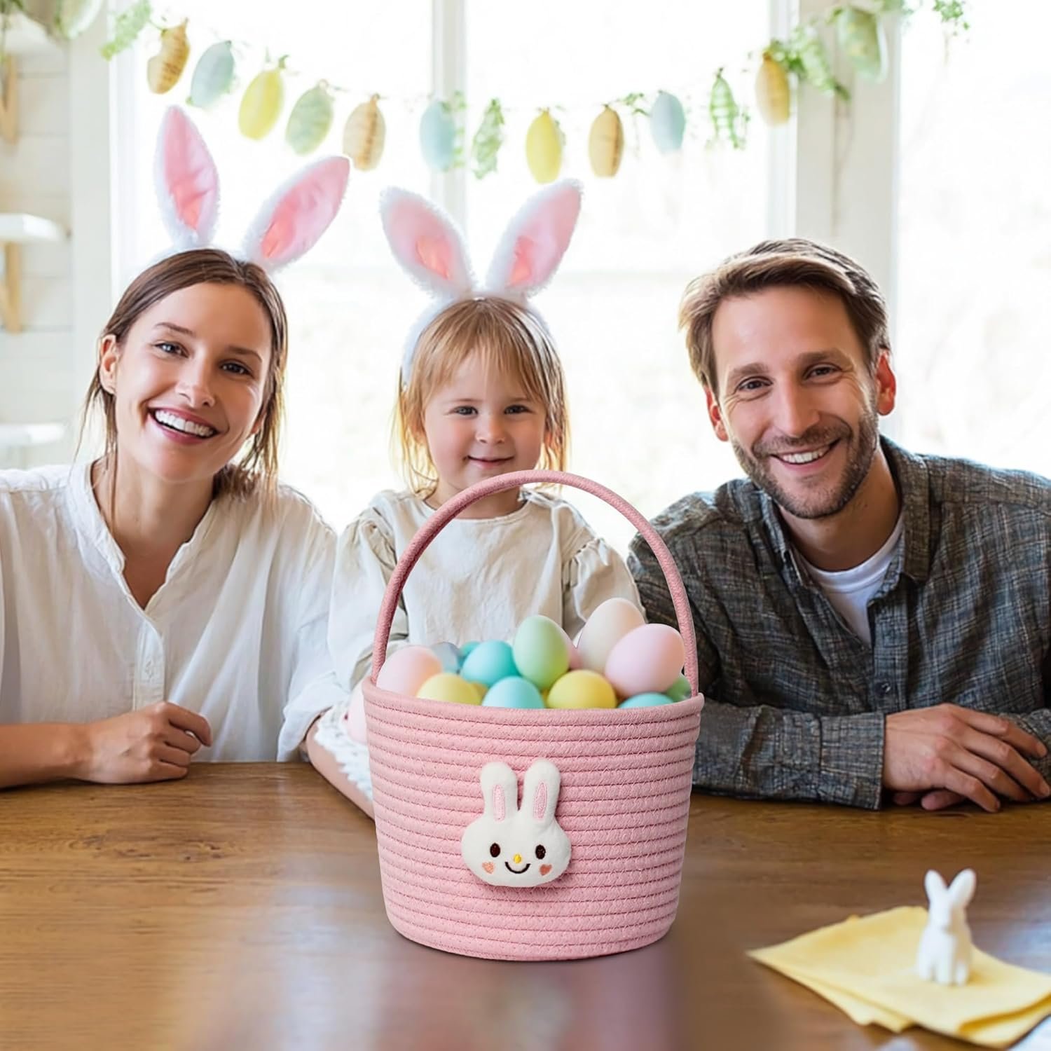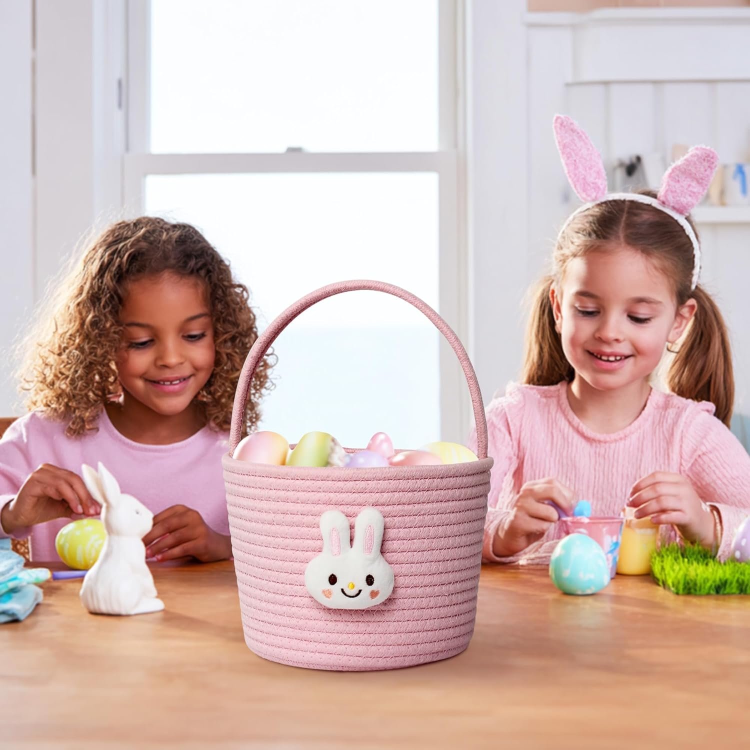 Adorable Bunny Easter Design: Features a cute plush bunny face with soft details and pastel pink tones, making this Easter basket a charming favorite for kids and toddlers. The woven texture add a modern touch for Easter Holiday. Perfect for adding festive charm to egg hunts, room decor or gift giving.