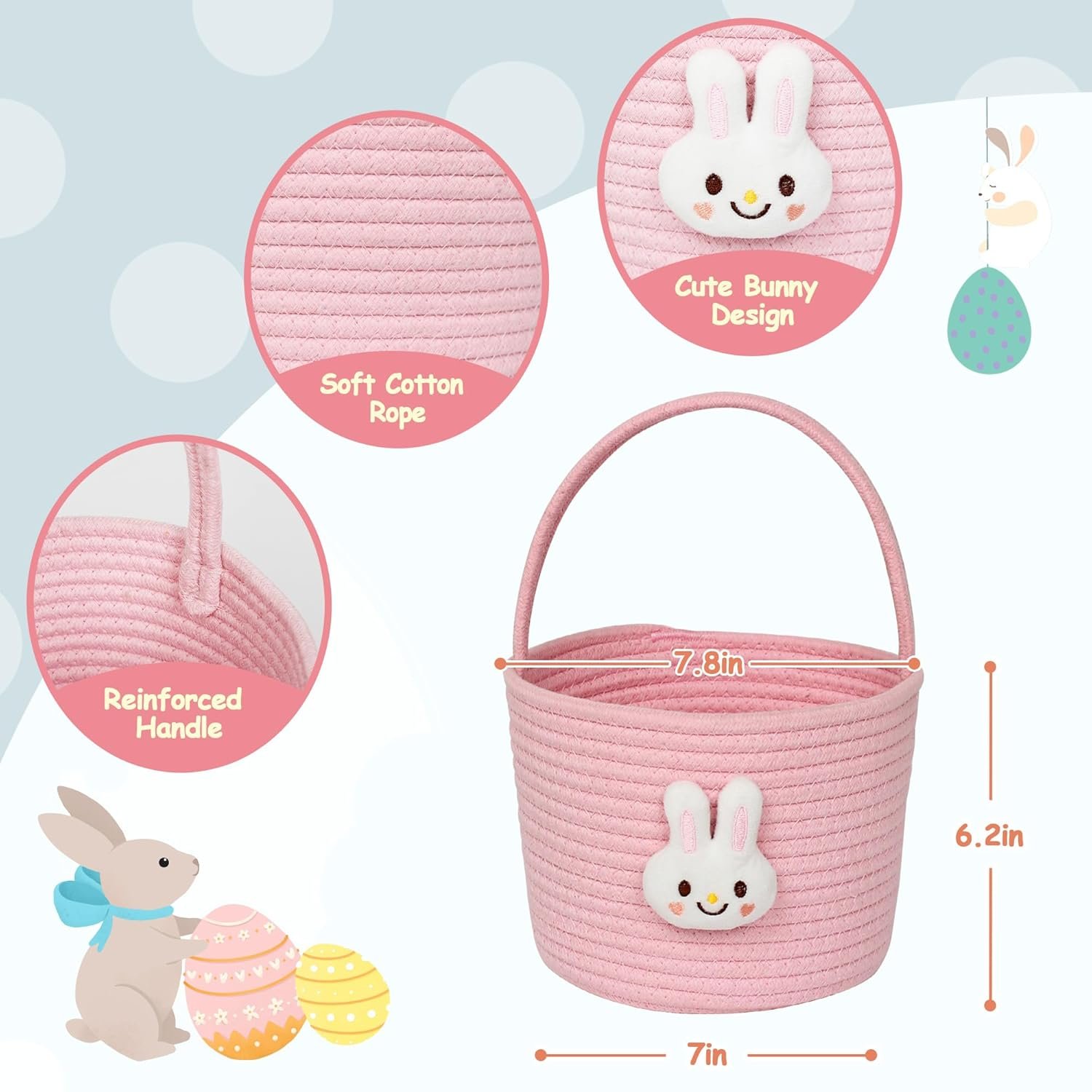 Soft and Durable Cotton Rope: Handwoven from high-quality natural cotton rope, this Easter basket is sturdy yet gentle to the touch. Non-toxic and safe for boys and girls, it’s built for long-term use and offers reliable support for eggs, candy, small toys, and festive gifts—a durable alternative to flimsy plastic or felt Easter bags.