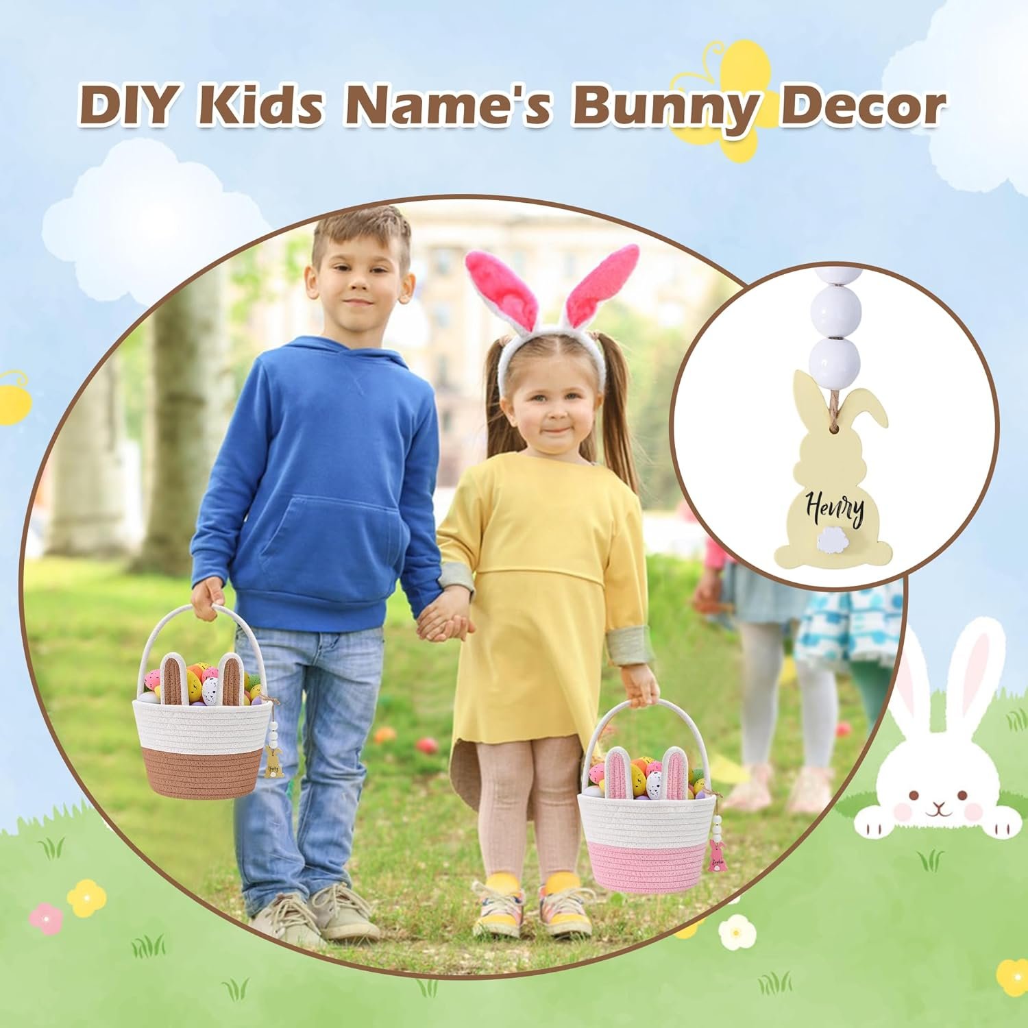 BUNNY EASTER BASKETS: Our Easter basket offer playful bunny designs, and each baby Easter basket comes with detachable bunny ears and a DIY bunny shape Easter basket name tag. Kids can write their names on the tags, creating a festive atmosphere and allowing them to fully experience the unique of Easter . This enhances the joy and memorable moments of Easter celebrations.