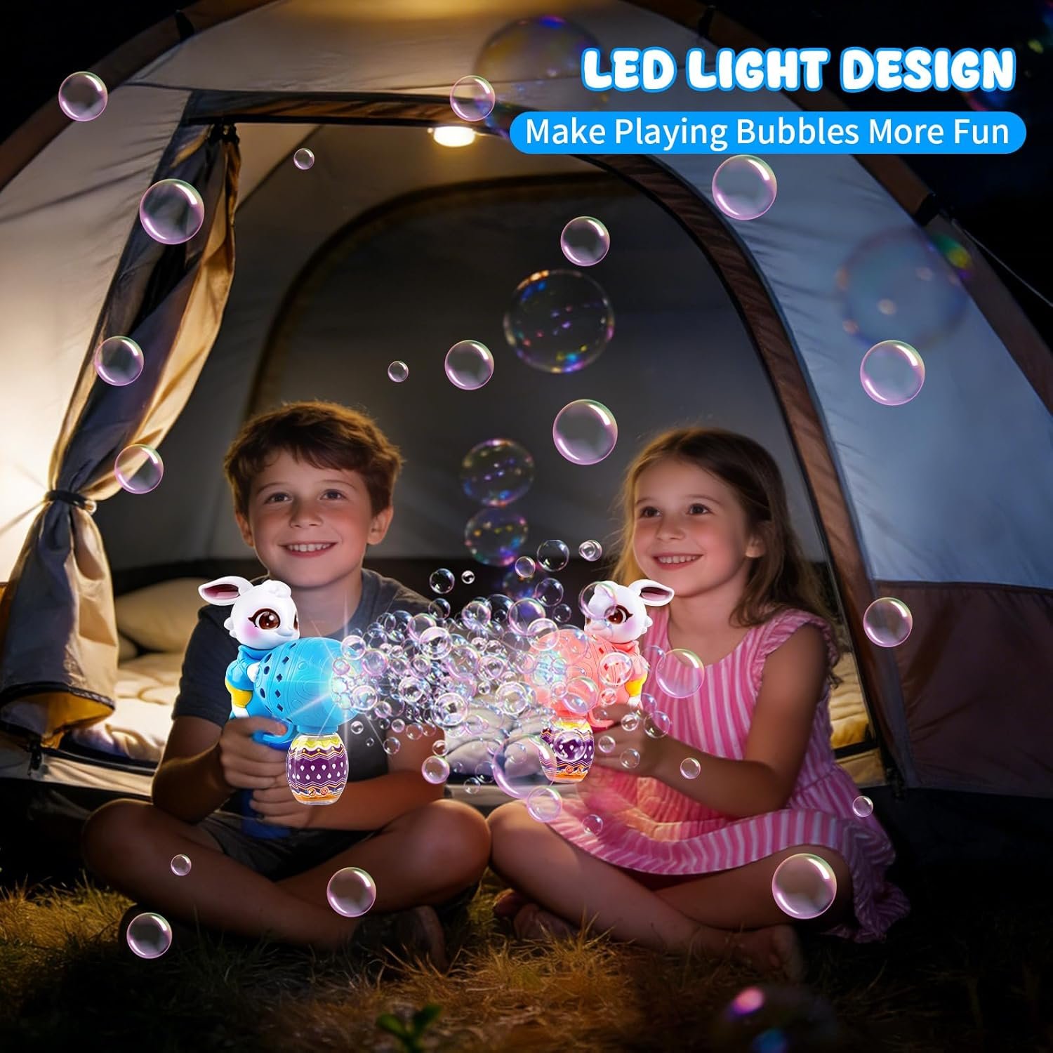 2-Pack Bubble Gun Set, Ready for Party Play: Includes 2 bunny bubble guns and 2 bottles of 80ML bubble solution, great for siblings, friends, or party sharing. Just install 4 AA batteries (not included), pull the trigger and enjoy non-stop bubble fun at home or outdoors.