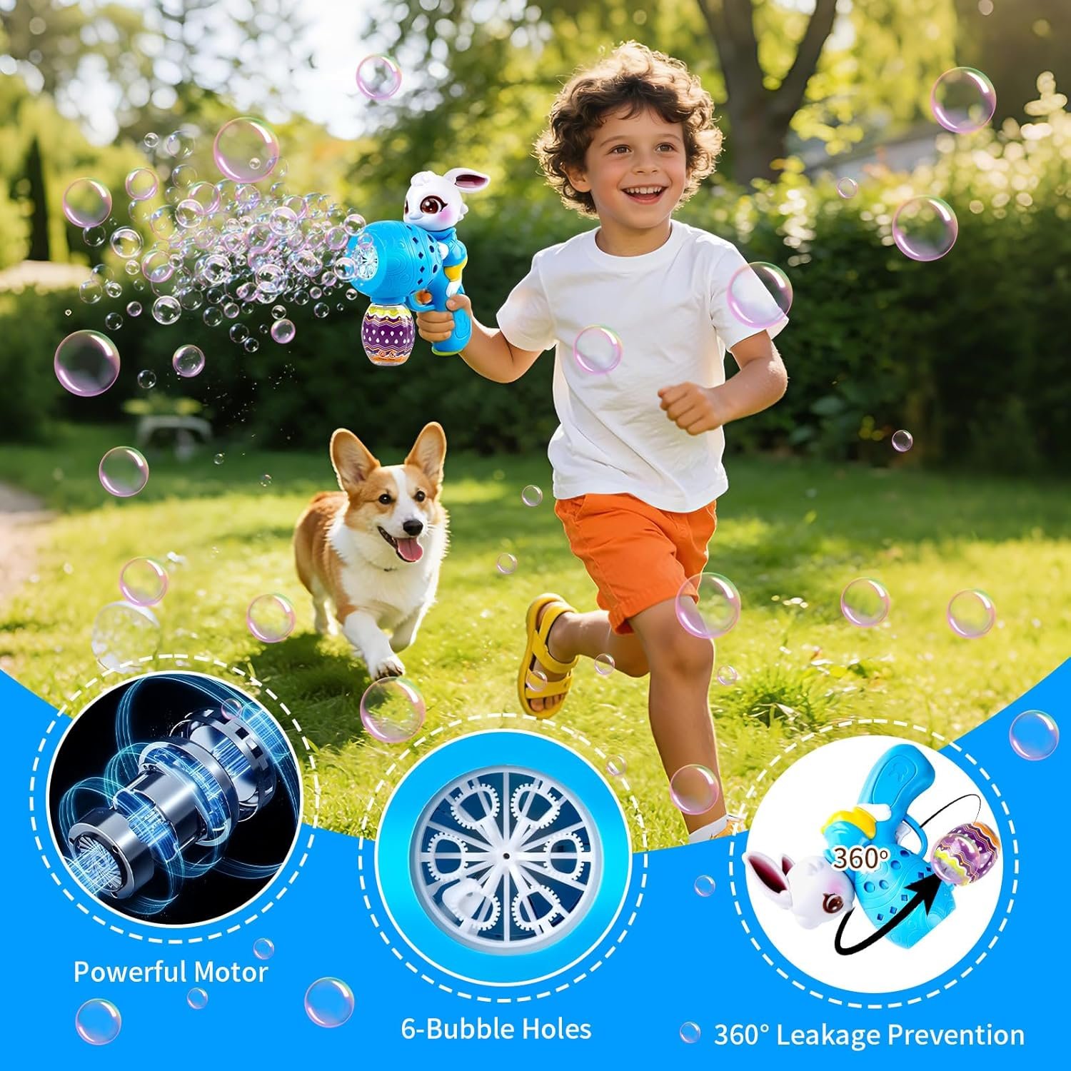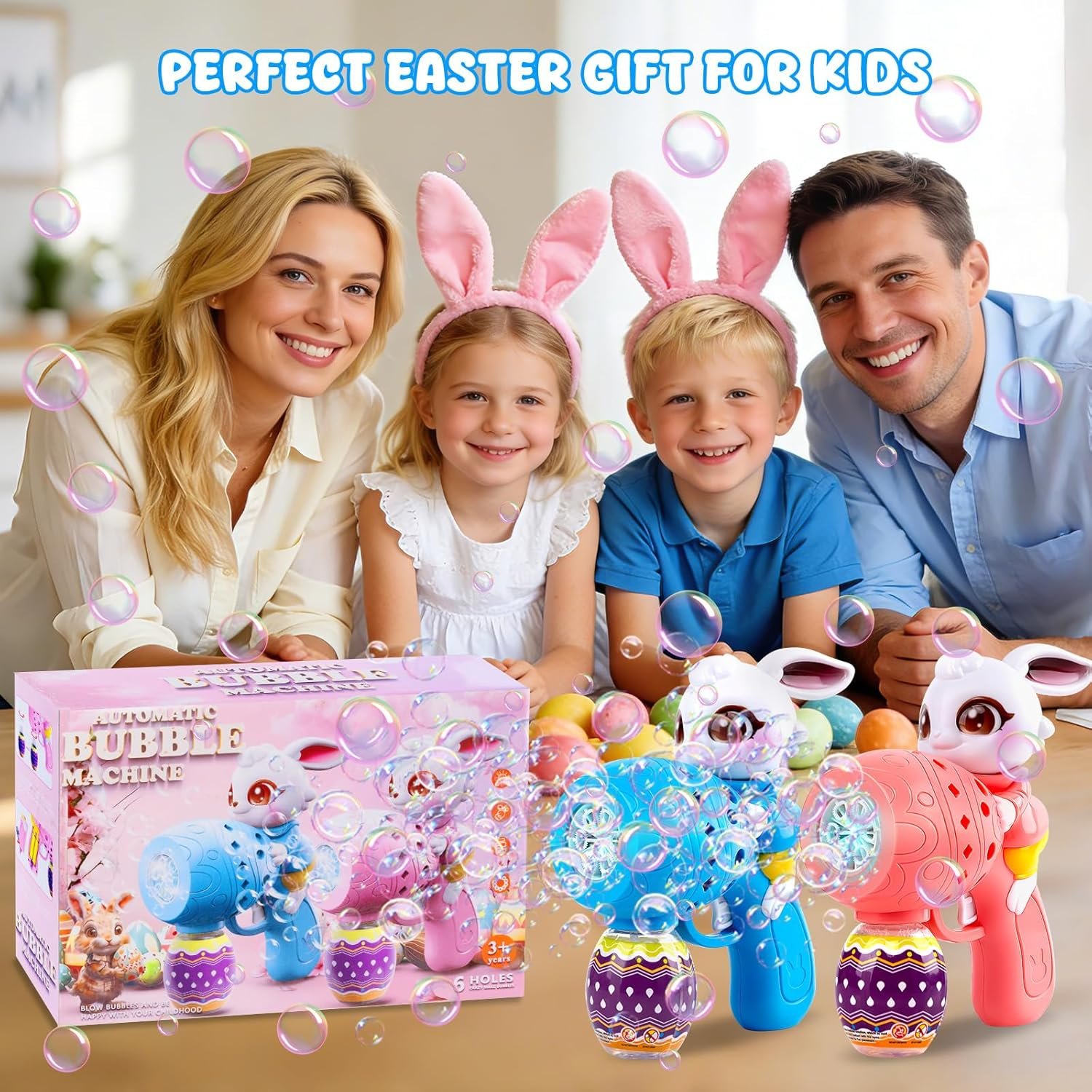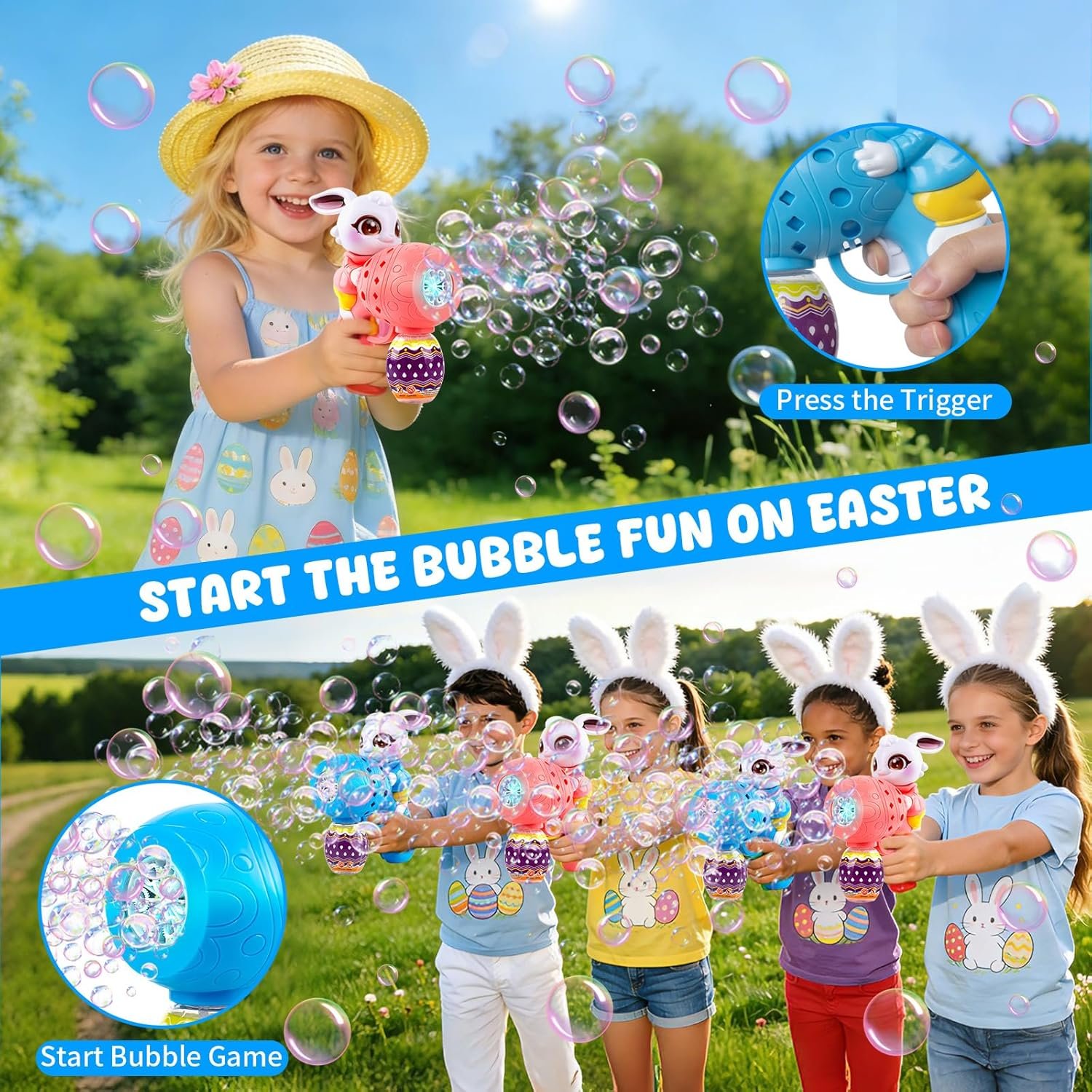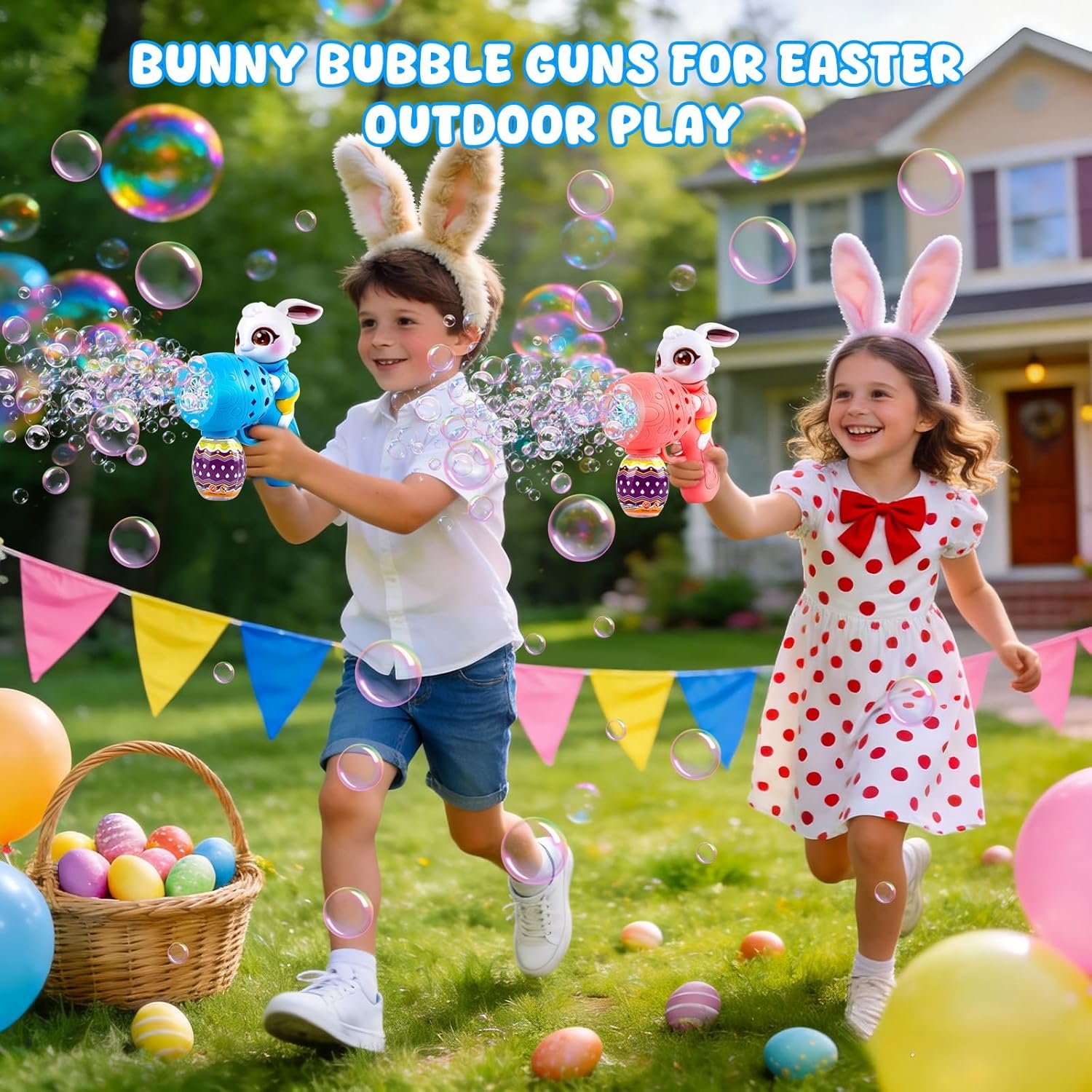 Dorable Bunny Bubble Guns for Easter Fun: Cute rabbit-shaped bubble gun set with one blue and one pink, specially designed as fun Easter toys for kids. Perfect for Easter egg hunts, spring parties, backyard play, party favor and outdoor games. A must-have bubble toy for boys and girls.