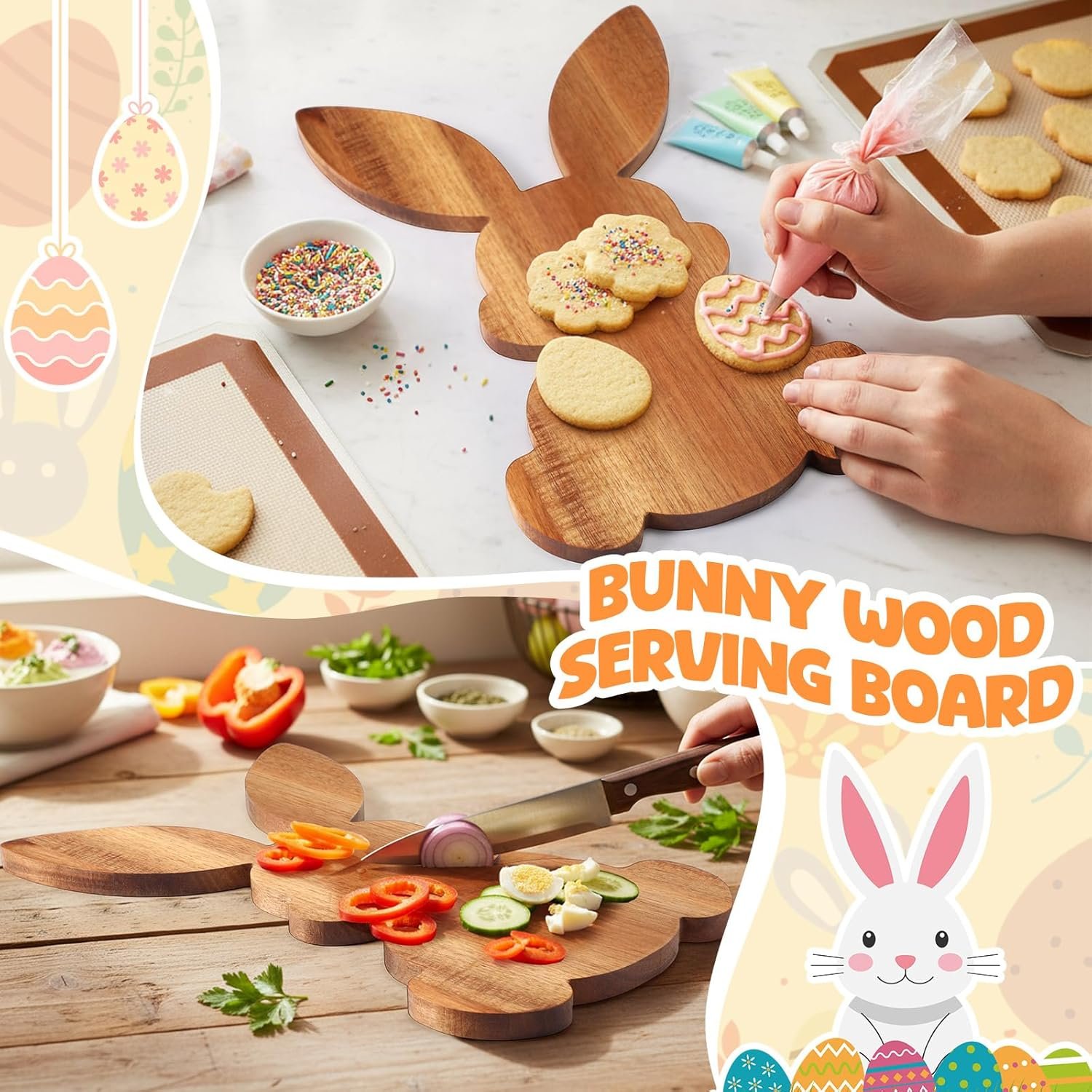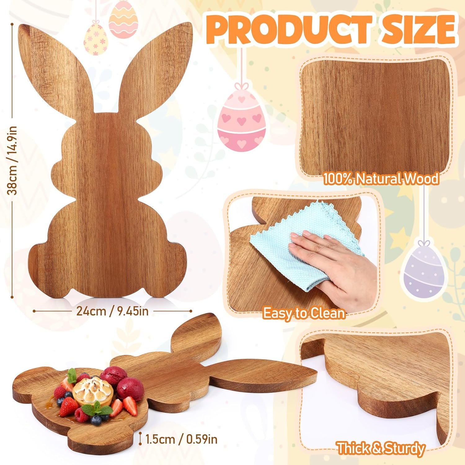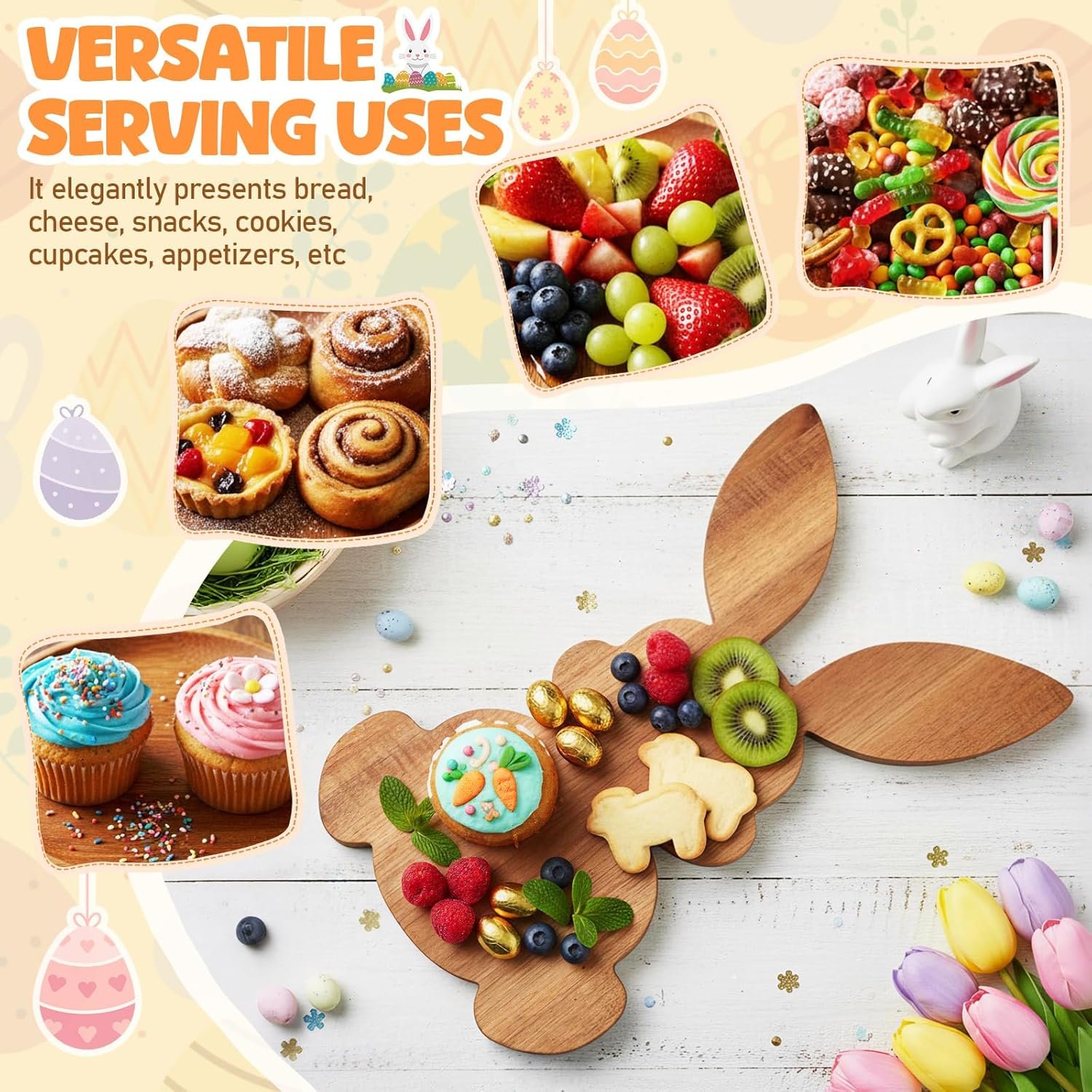 Unique Easter Decoration Accent: this easter charcuterie board sports a delicate easter bunny design; At 15 inches long and 9.5 inches wide, it’s vividly cute and one – of – a – kind; It instantly boosts the easter vibe, making meals fun and surprising; As a dessert stand, it’s a party’s visual highlight, creating cherished gathering moments