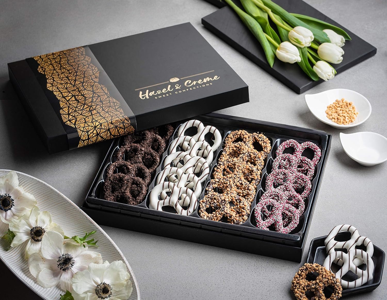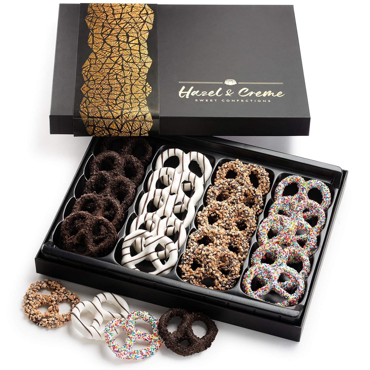 Give the ultimate gift of giving with one of Hazel & Creme’s beautiful eye popping chocolate covered cookie gift boxes Hazel and Creme chocolate covered pretzel have a delicious combination of flavors and textures. Nothing says “Thank You” or “I Love You” like a box of heavenly box of Hazel and Creme’s treats. Add sweetness to any special occasion from holidays, birthdays, to anniversaries. Surprise someone special with Hazel & Creme’s gifts which are always a perfect choice. From beautiful packaging to delicious flavor Hazel & Creme’s Birthday Collection boxes are truly one of a kind.