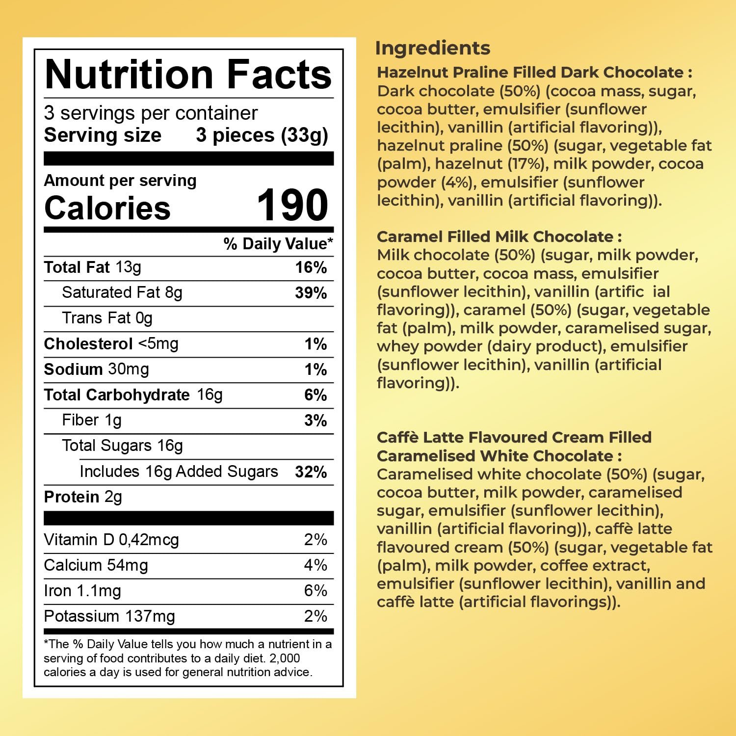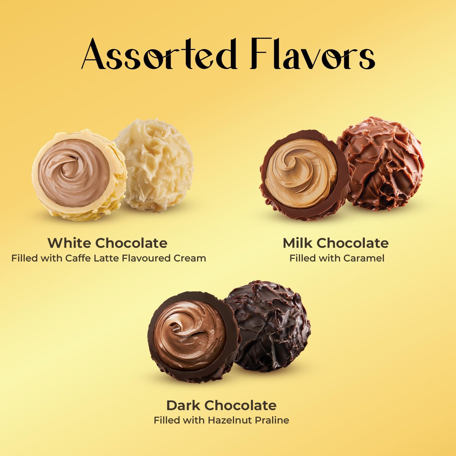 Discover three distinct fillings wrapped in premium chocolate: