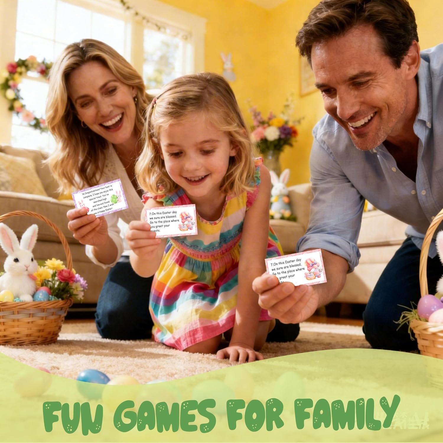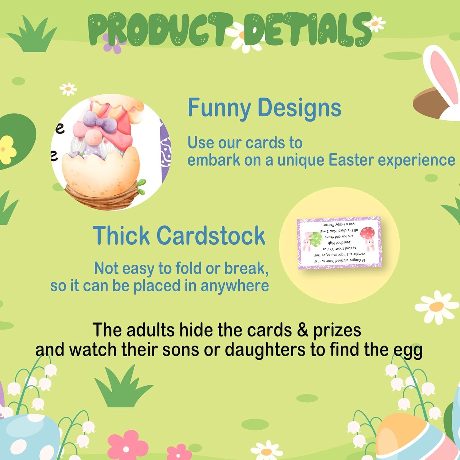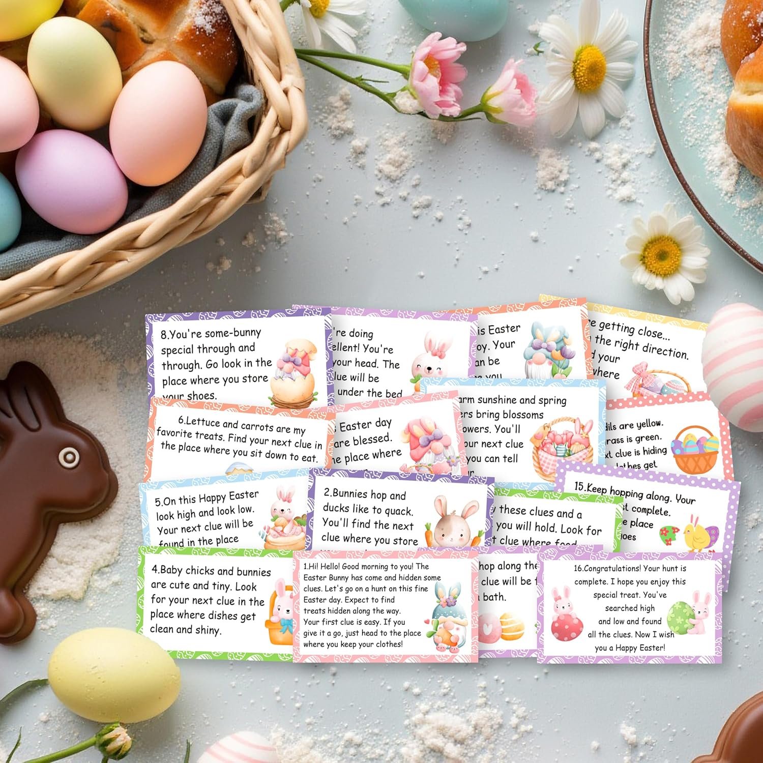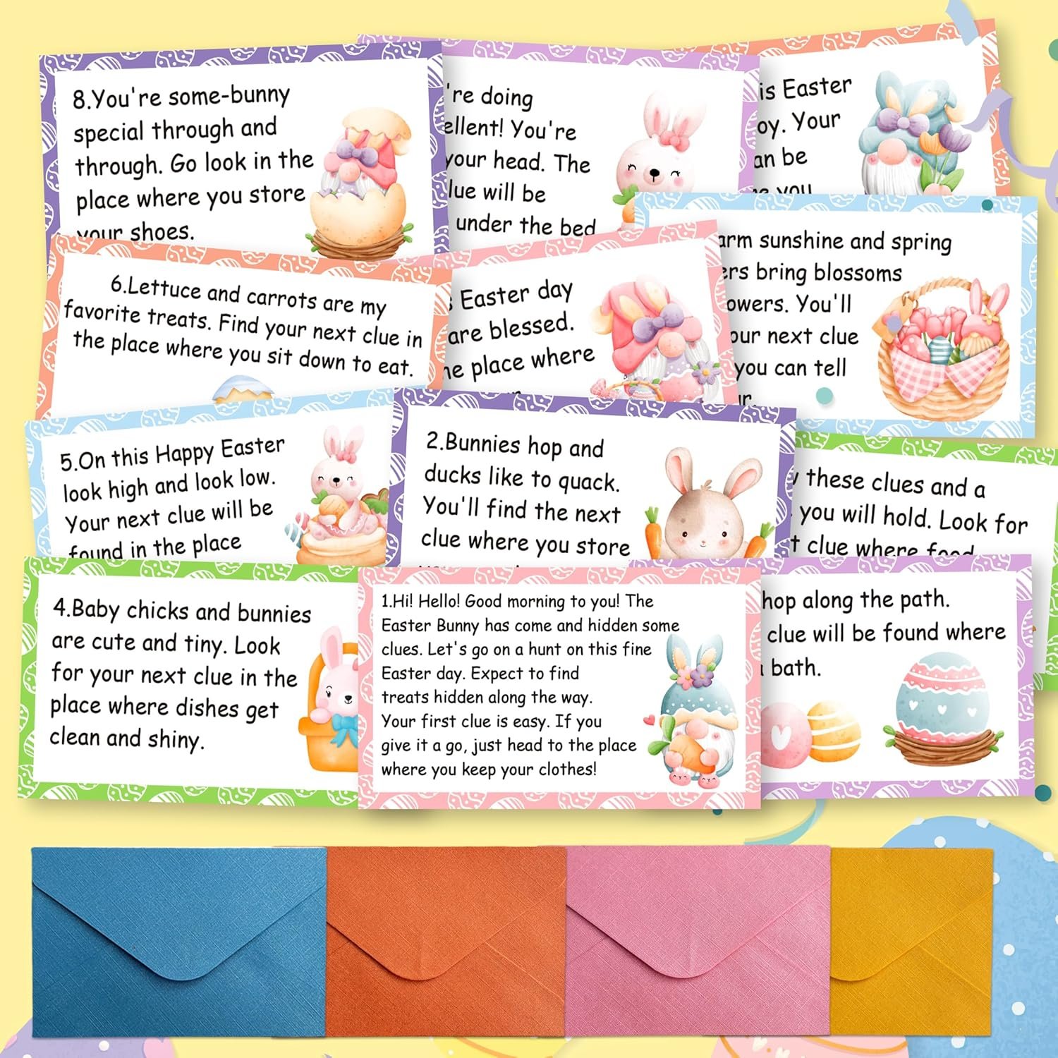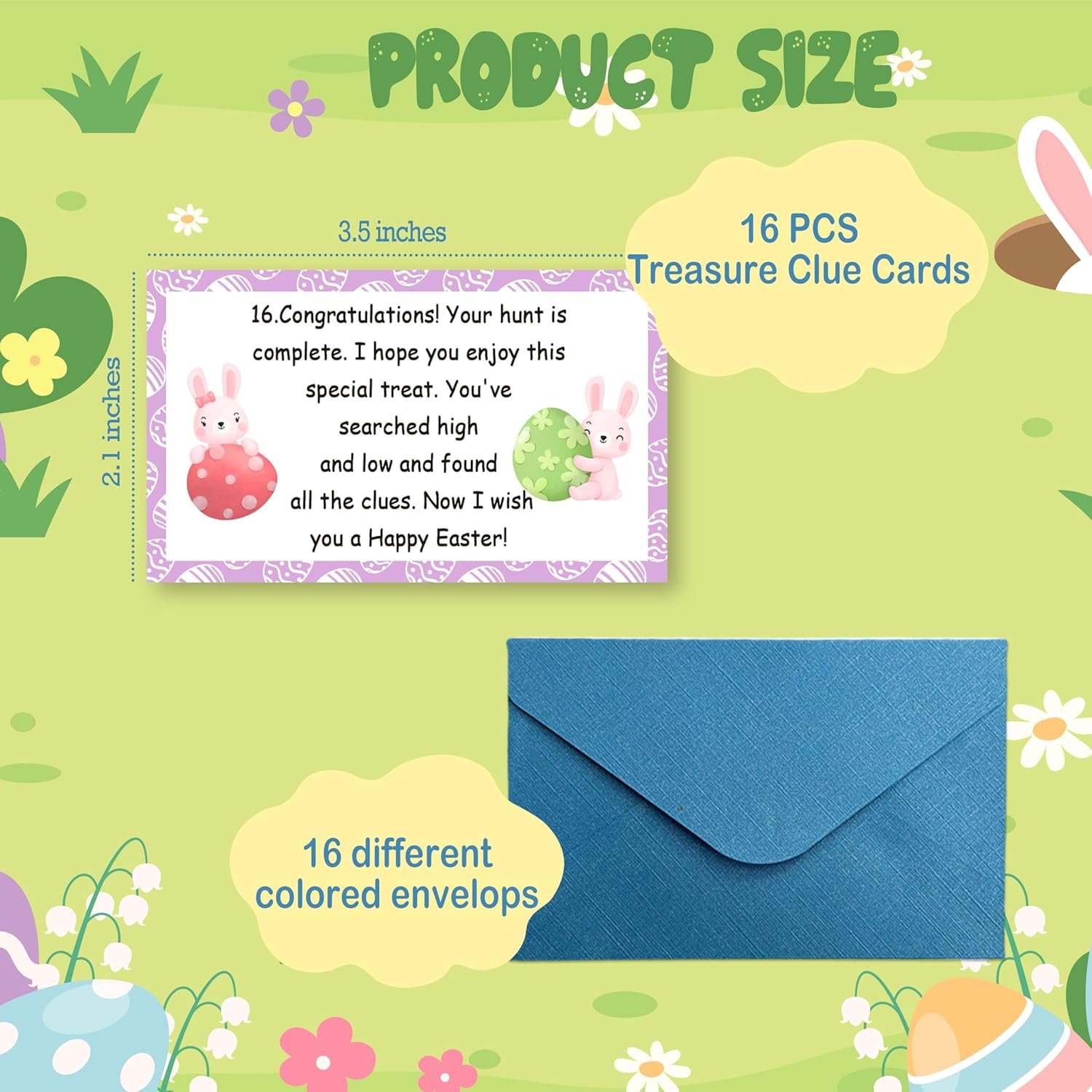 【Easter Party Game Set】 The set contains 16 treasure clue cards and 16 colorful envelopes. Each card measures approximately 3.5 x 2 inches and is suitable for family games, allowing both adults and children to participate together