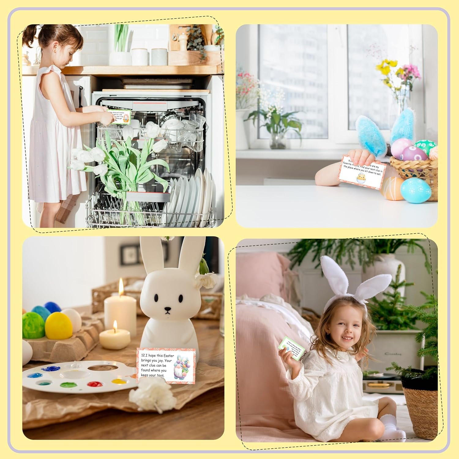 【Easter Party Game Set】 The set contains 16 treasure clue cards and 16 colorful envelopes. Each card measures approximately 3.5 x 2 inches and is suitable for family games, allowing both adults and children to participate together 【Game rules】 Before the game starts, you should hide clues at the places mentioned in the hidden space. First, give the player the first clue. These cards include many common indoor positions, such as dishwashers, sofas, and so on 【High-quality Cards】 The card is designed with Easter elements as the theme, featuring a cute design. Each card is printed on high-quality coated paper to ensure a vivid and high-quality design 【Meaningful Games】 These treasure hunt games require riddles to find clues, which helps to stimulate critical thinking. Having parents act together with their children can help them build connections. The joy of solving puzzles will fill everyone with enthusiasm 【Wide Application】 This game can be played at birthday parties, family gatherings and during leisure time. Suitable for both adults and children to play together