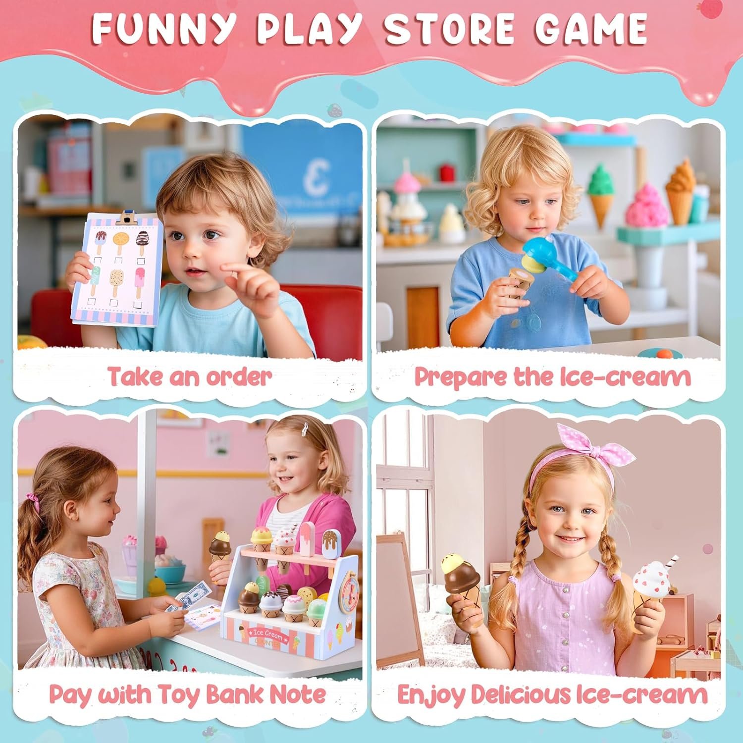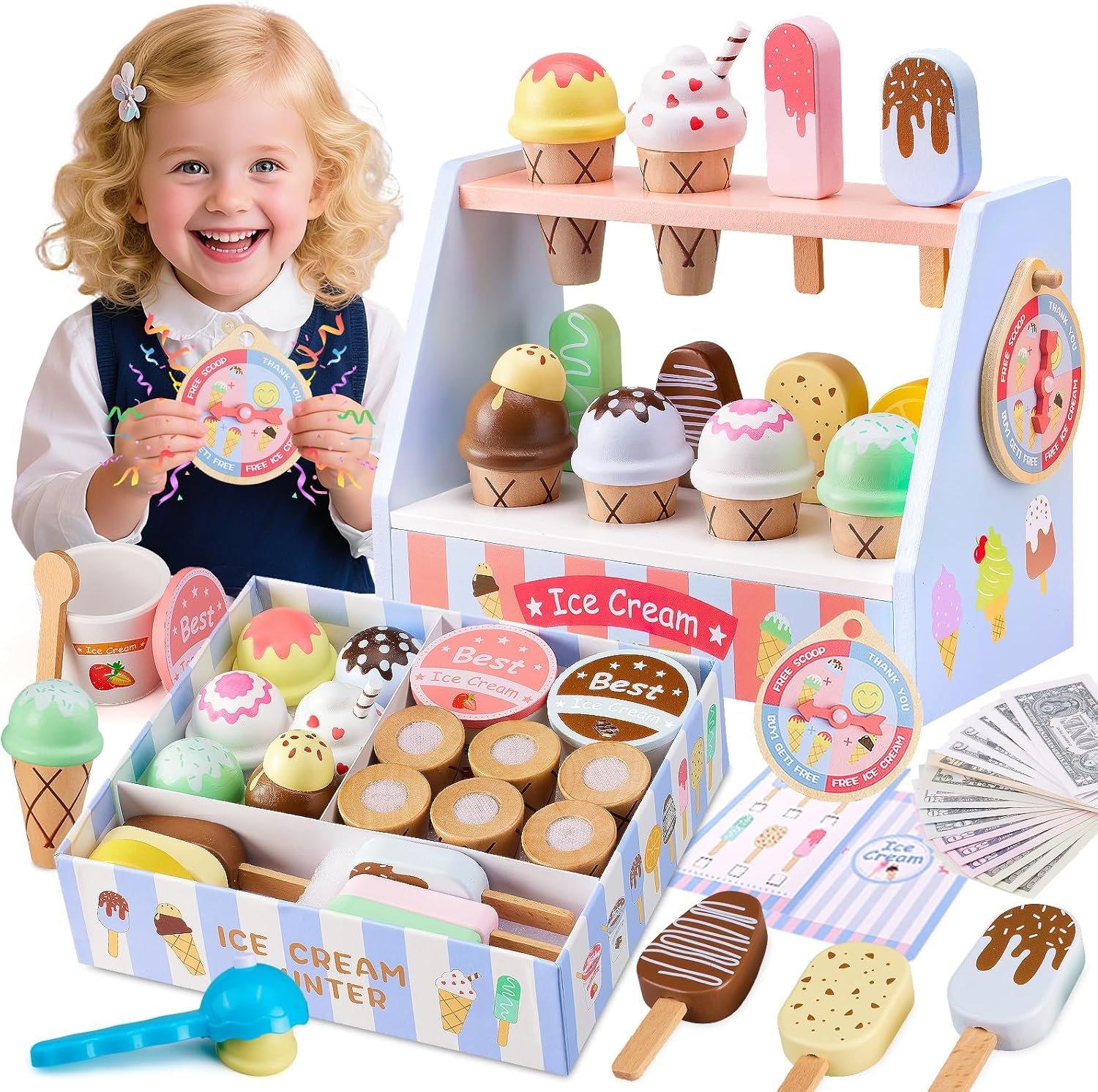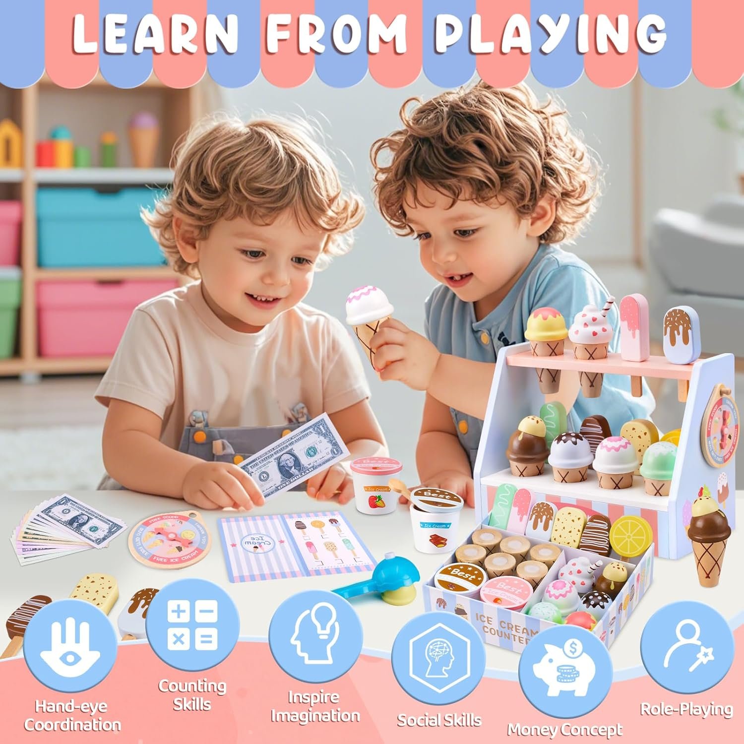 MASSIVE 46-PIECE VALUE SET: Includes everything needed to run a busy shop: a sturdy wooden counter, 8 scoops of ice cream, 6 ice pops, 2 toppings, a scooper, and more. The abundant accessories allow multiple children to play together, fostering social skills and cooperation.