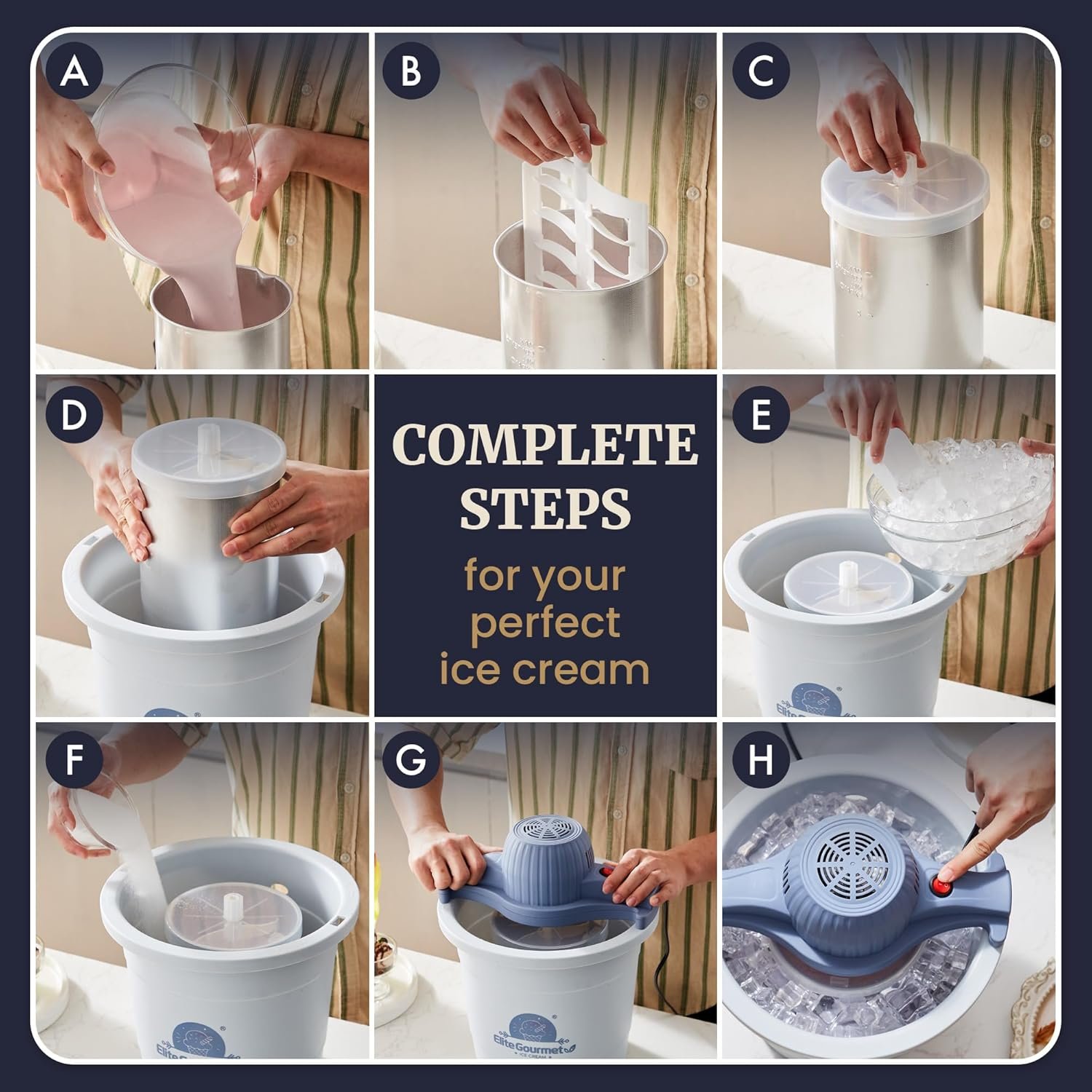 EFFORTLESS ENJOYMENT: Using the Elite Gourmet Ice Maker is a breeze. Simply place prepared ice cream mix into the aluminum freezing cannister and place into the ice bucket, install the electric motor, then add ice & salt, plug in & turn On. Perfect, fluffy ice cream and other delicious treats will be ready to serve in no time! Add your favorite condiments and indulge in a cold, fresh & frosty treat!