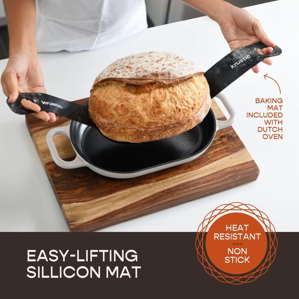 VERSATILE COOKING: Transform your kitchen into a culinary workshop with this versatile cast iron pot with lid. Our dutch ovens are perfect for artisanal bread, slow-cooked meals, and everyday cooking/baking. The thoughtfully designed handles of this enameled cast iron dutch oven provide secure grip, while the tight-fitting lid locks in moisture. The loaf bread oven package includes a bonus silicone mat for easy dough handling.