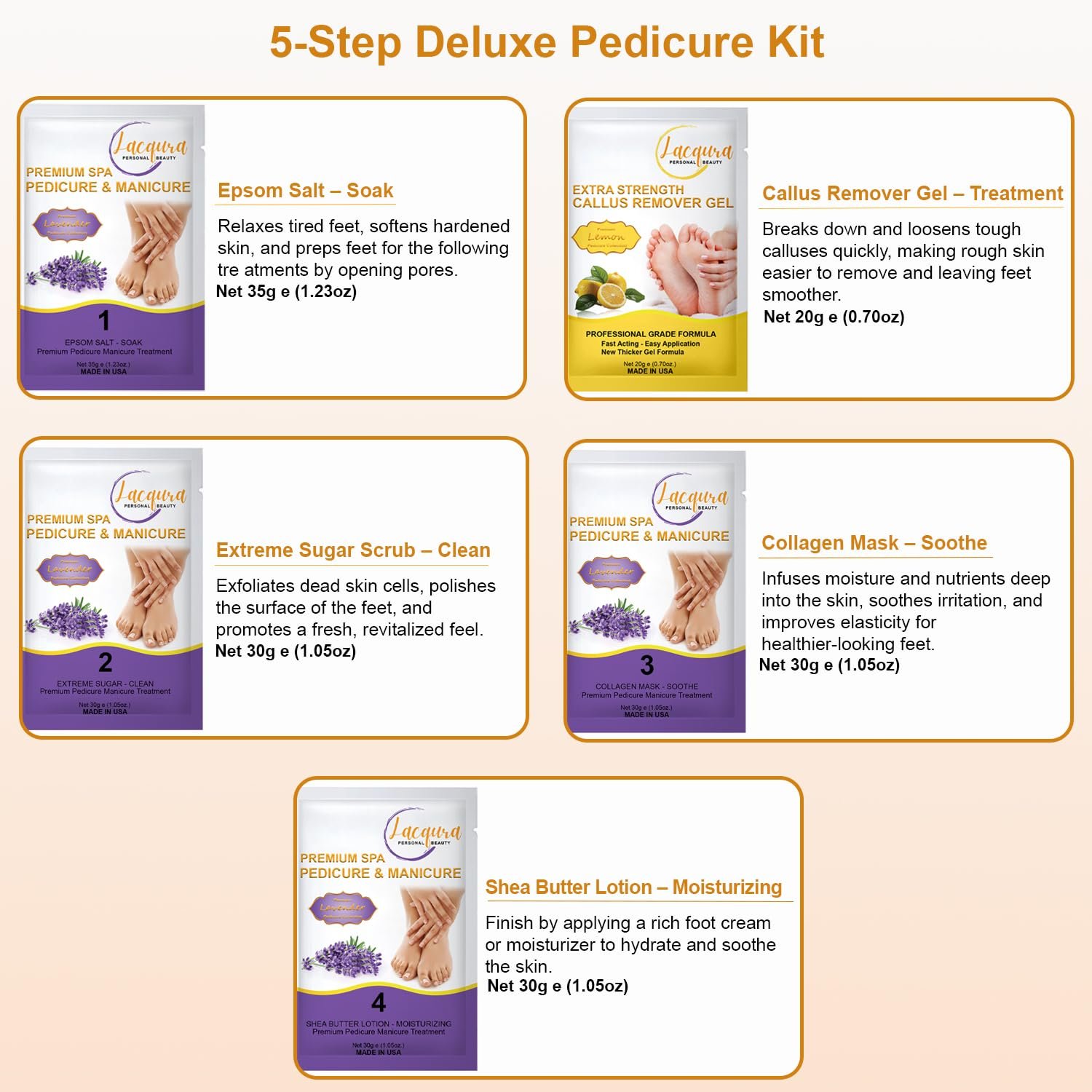 Complete 5-Step Pedicure Kit for Spa-Quality Results – Transform your foot care routine with a professional pedicure system that includes Epsom Salt Soak, Callus Remover Gel, Sugar Scrub, Collagen Mask & Shea Butter Lotion. Perfect for at-home self-care or salon use.
