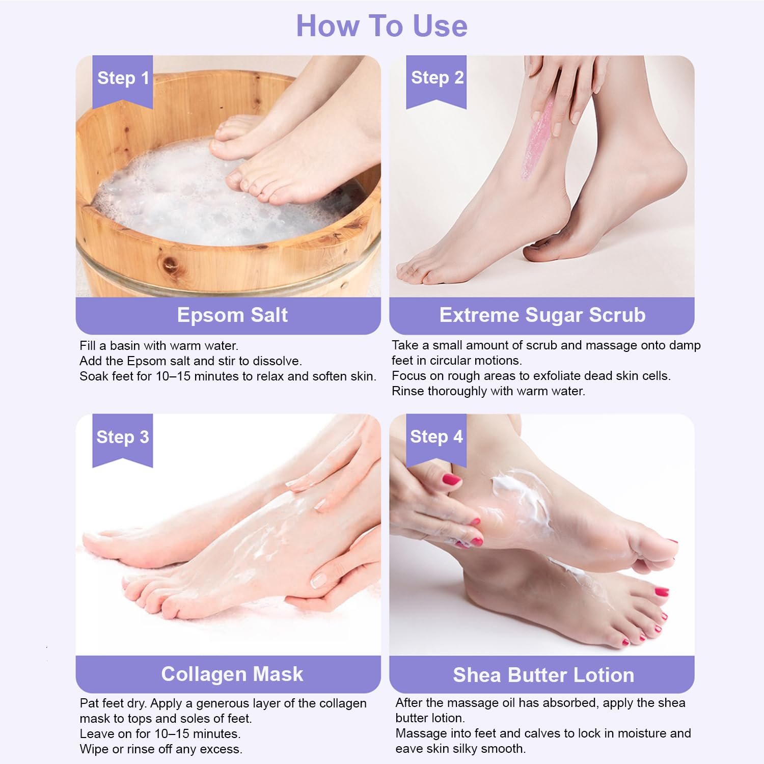 Step 5: Shea Butter Lotion – Moisturize & Protect – A rich, creamy shea butter lotion delivers long-lasting hydration, locks in moisture, and restores smoothness. Perfect finishing touch to keep feet nourished and protected all day.