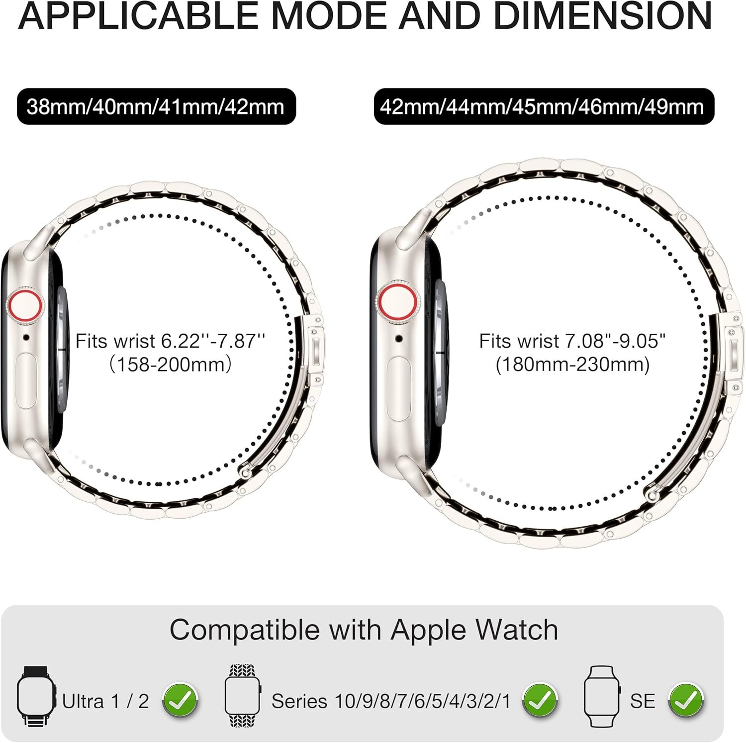 【Adjustable Length】: 49mm 46mm 45mm 44mm 42mm fits wrist size 7.08″-9.05″(180mm-230mm). It’s easy to resize by splitting links. How to Remove & Install the links? Please look at our Video and Instruction Manual