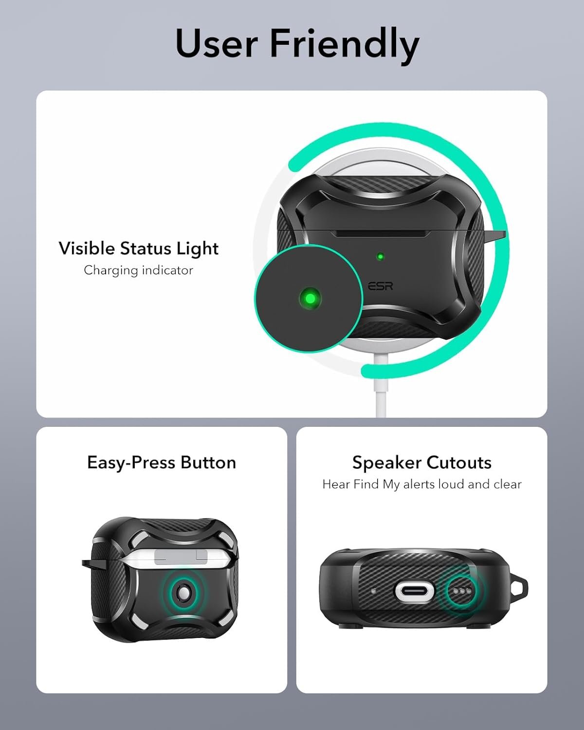 The video showcases the product in use.The video guides you through product setup.The video compares multiple products.The video shows the product being unpacked. ESR AirPods Pro 2019/2022/2023 HaloLock 铁甲 暗夜黑 Merchant Video