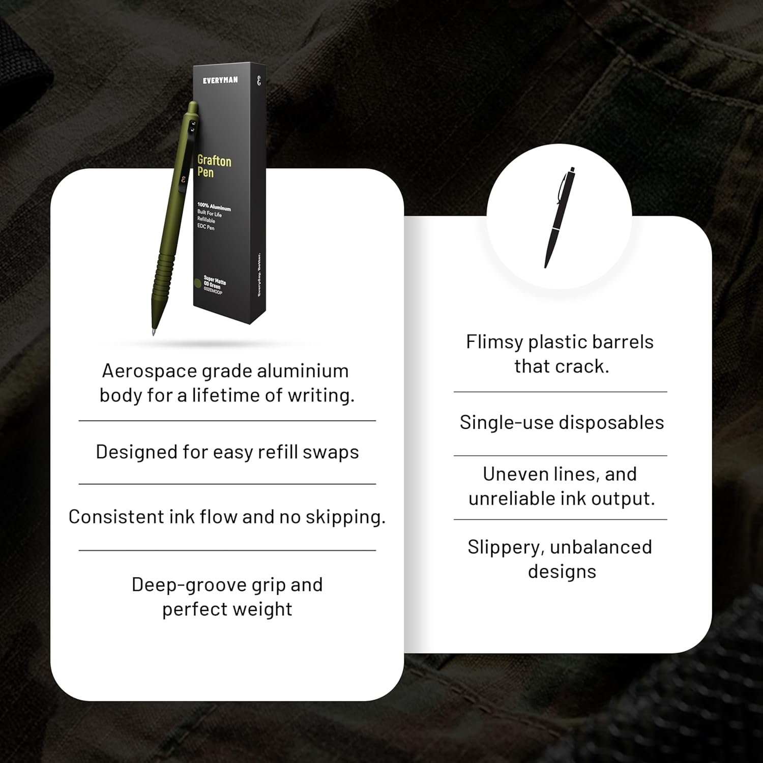 Built to Last with Refillable Gel Cartridges: Say goodbye to disposable pens. This reusable gel pen supports easy cartridge replacements, saving money and reducing waste. Compatible with Grafton refills and standard ink cartridges, it’s your go-to sustainable EDC pen for the long haul.