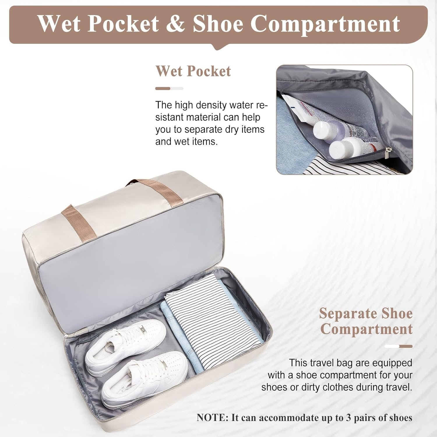 Weekender Bag With Shoe Compartment: This womens travel bag features a dedicated shoe compartment at the bottom that keeps your shoes separate from clothes for superior hygiene and organization. The wide-access design allows quick retrieval of shoes (fits up to 3 pairs) – perfect for gym, travel, or outdoor adventures