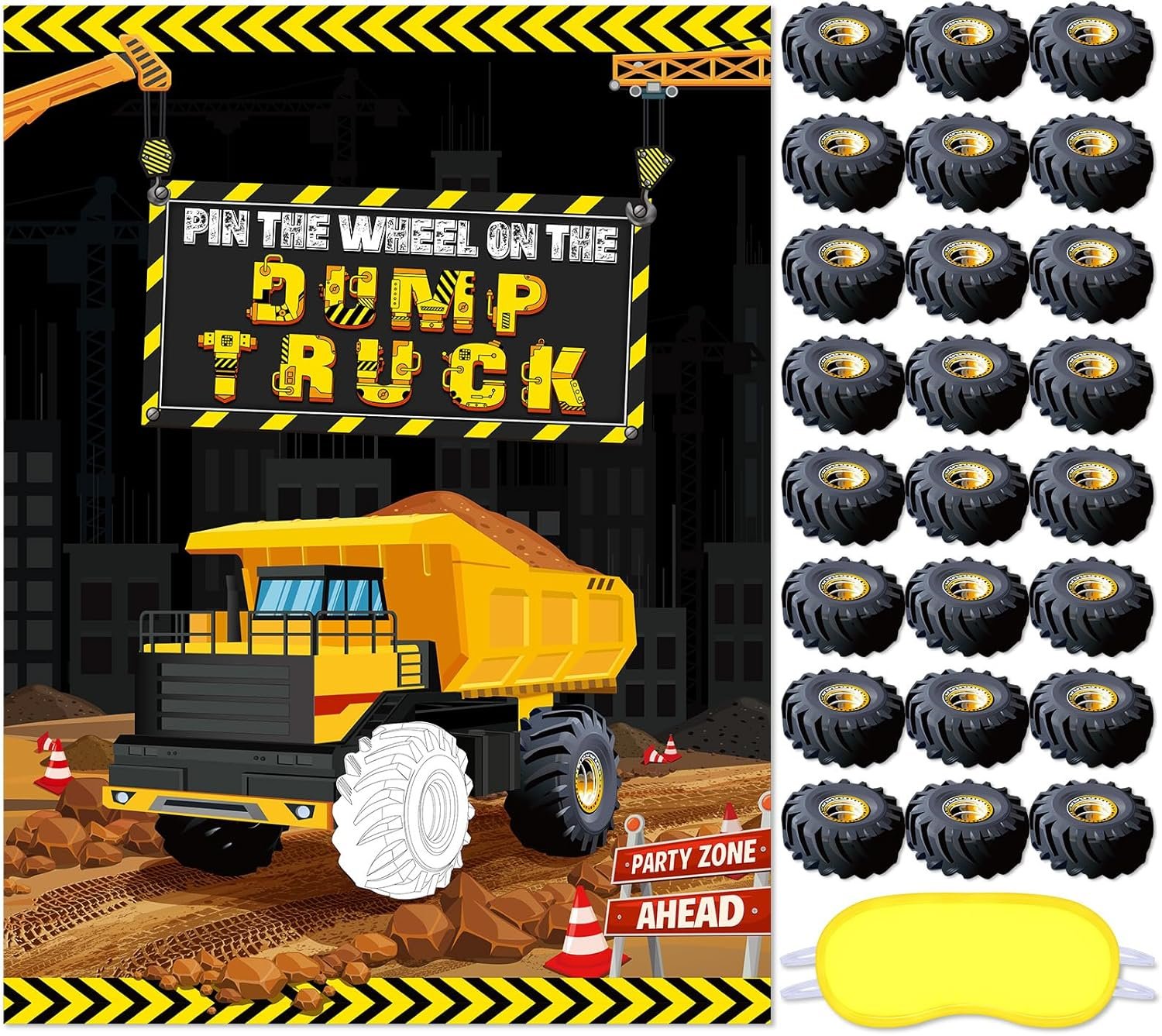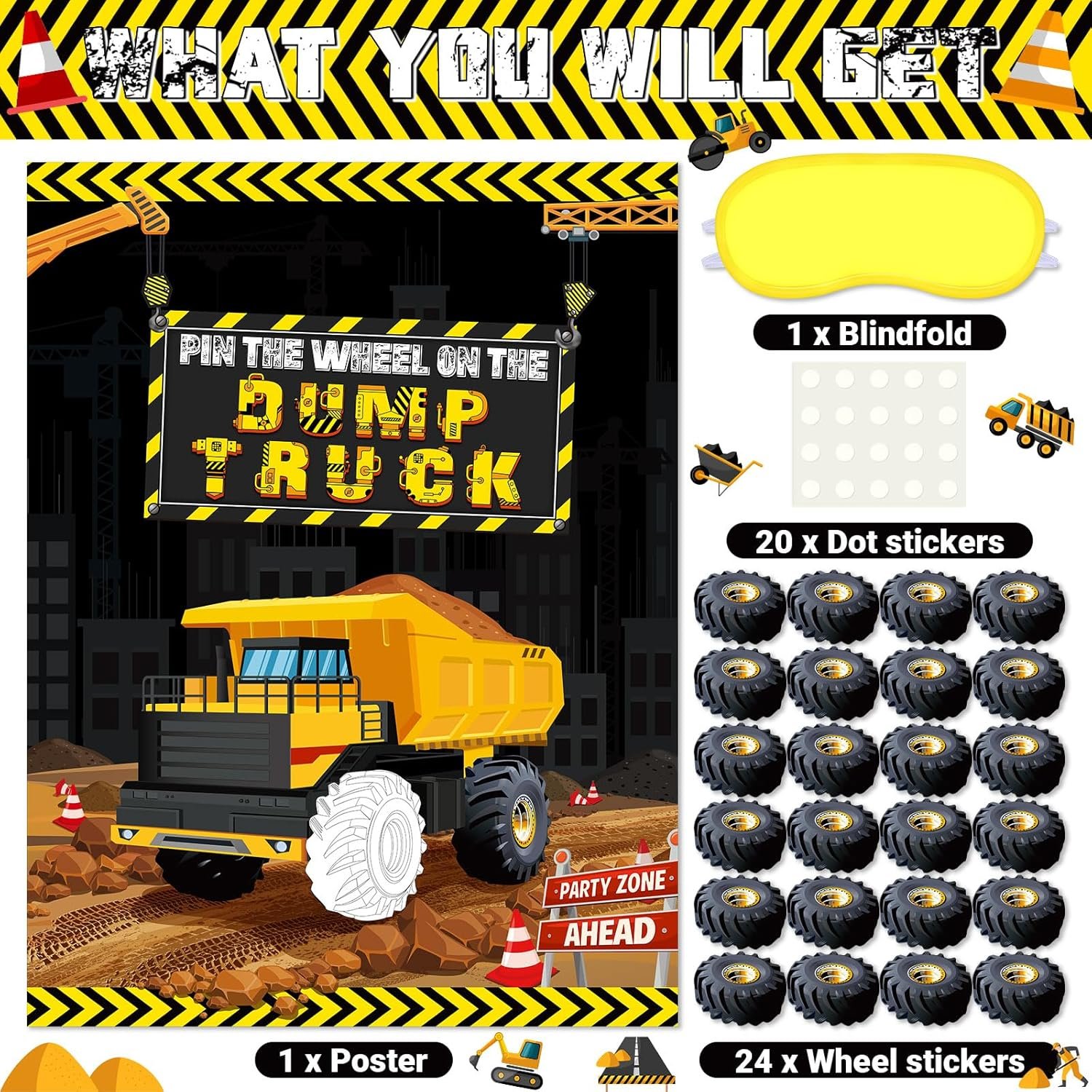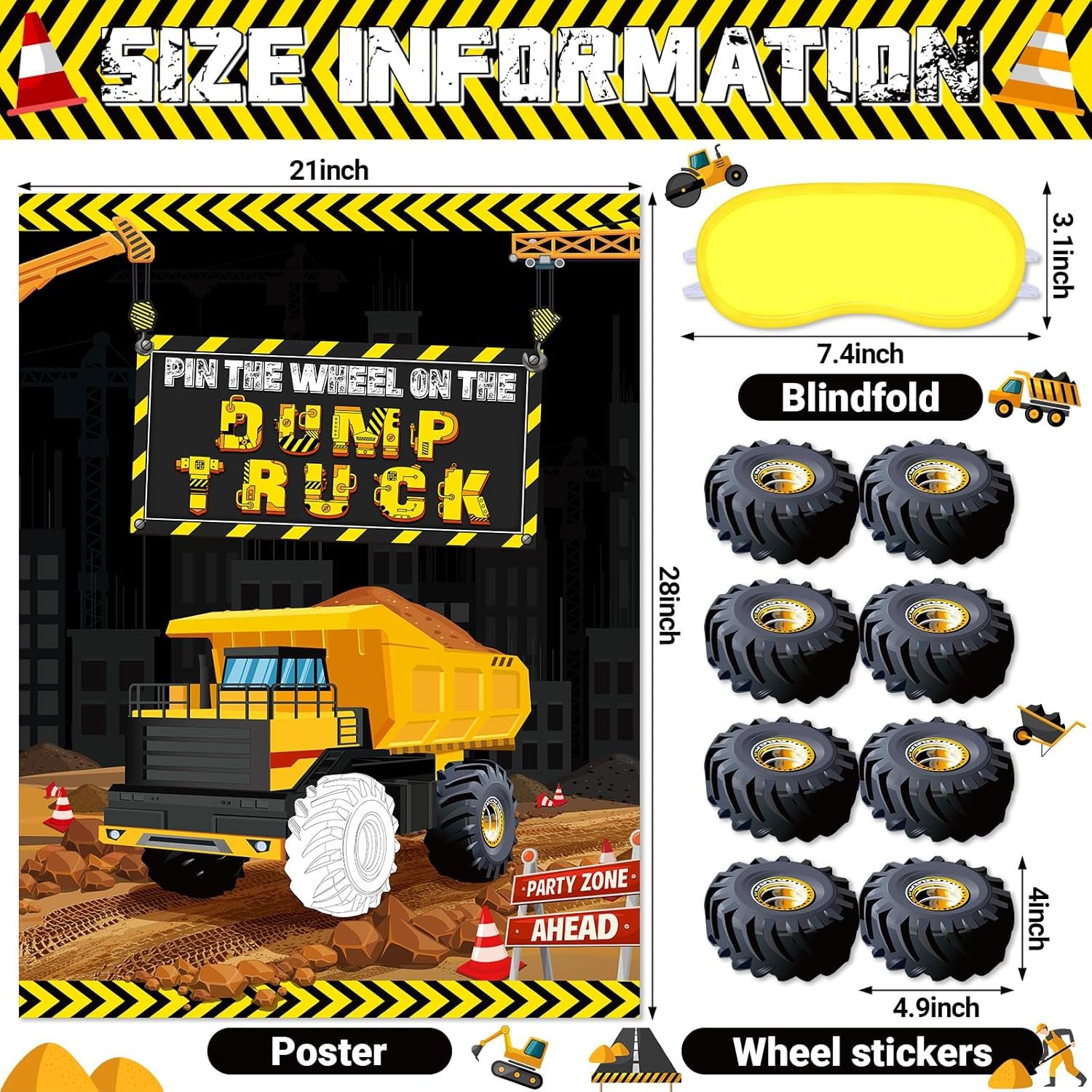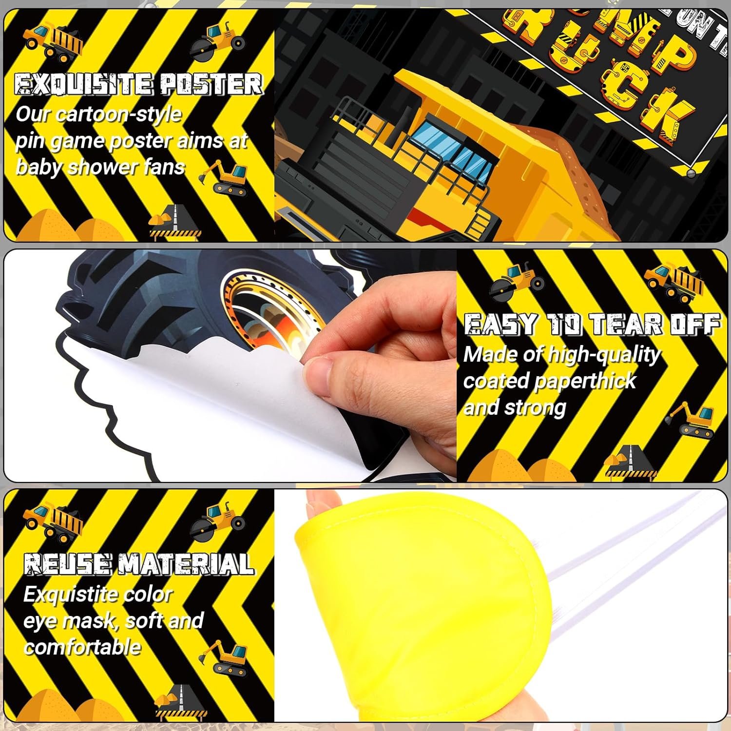Package Include: you will receive 27 pieces of construction theme party game, including 1 piece of truck theme poster, 1 piece of eye mask, 24 pieces of wheel stickers, and comes with 1 sheet of adhesive dot for easy to stick; Printed with construction theme elements, such as dump truck, traffic cone and so on, and match with classic yellow and black, the truck party game kit is full of theme atmosphere