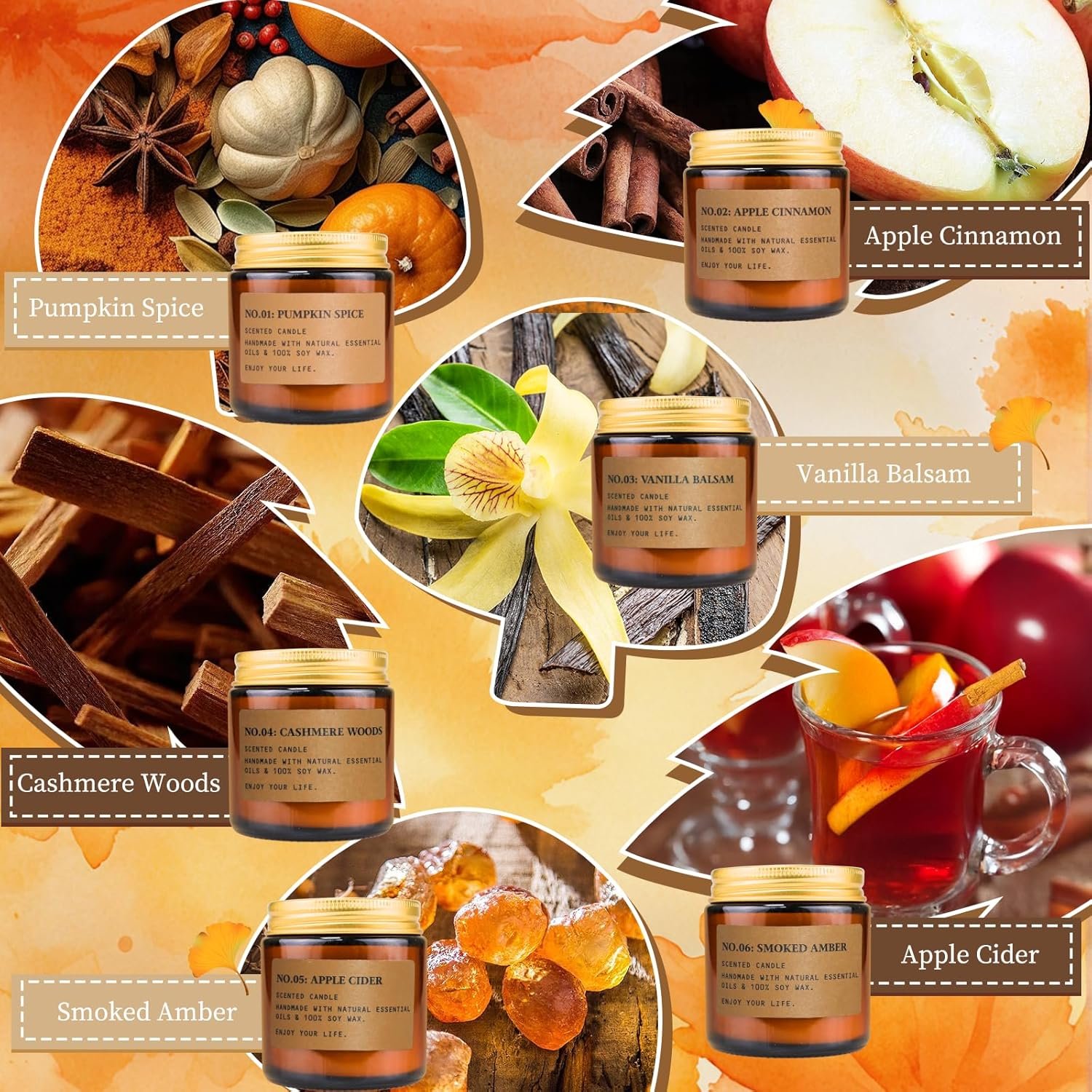 Pumpkin Spice: The classic flavor of fall. Warm, spicy, and utterly comforting.Apple Cinnamon: A sweet and spicy aroma of baked apples and warm cinnamon sticks.Vanilla Balsam: A cozy blend of creamy vanilla and the crisp, clean scent of balsam fir.Cashmere Woods: A sophisticated, warm, and inviting scent with notes of sandalwood and musk.Apple Cider: The nostalgic, sweet, and tangy scent of freshly mulled apple cider.Smoked Amber: A deep, sensual fragrance blending smoky notes with warm, resinous amber.