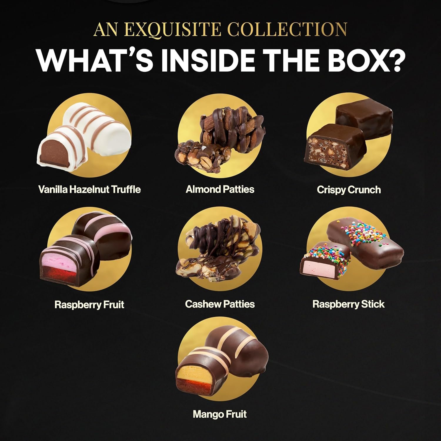 Exquisite Chocolate Assortment; Gift seven handcrafted chocolate treats; crunchy almond patties, white vanilla truffles, bright raspberry sticks, cashew patties, raspberry fruit, chocolate covered crispy squares, and mango truffles. A fancy chocolate gift box perfect for holiday gifts or New Year eve celebration