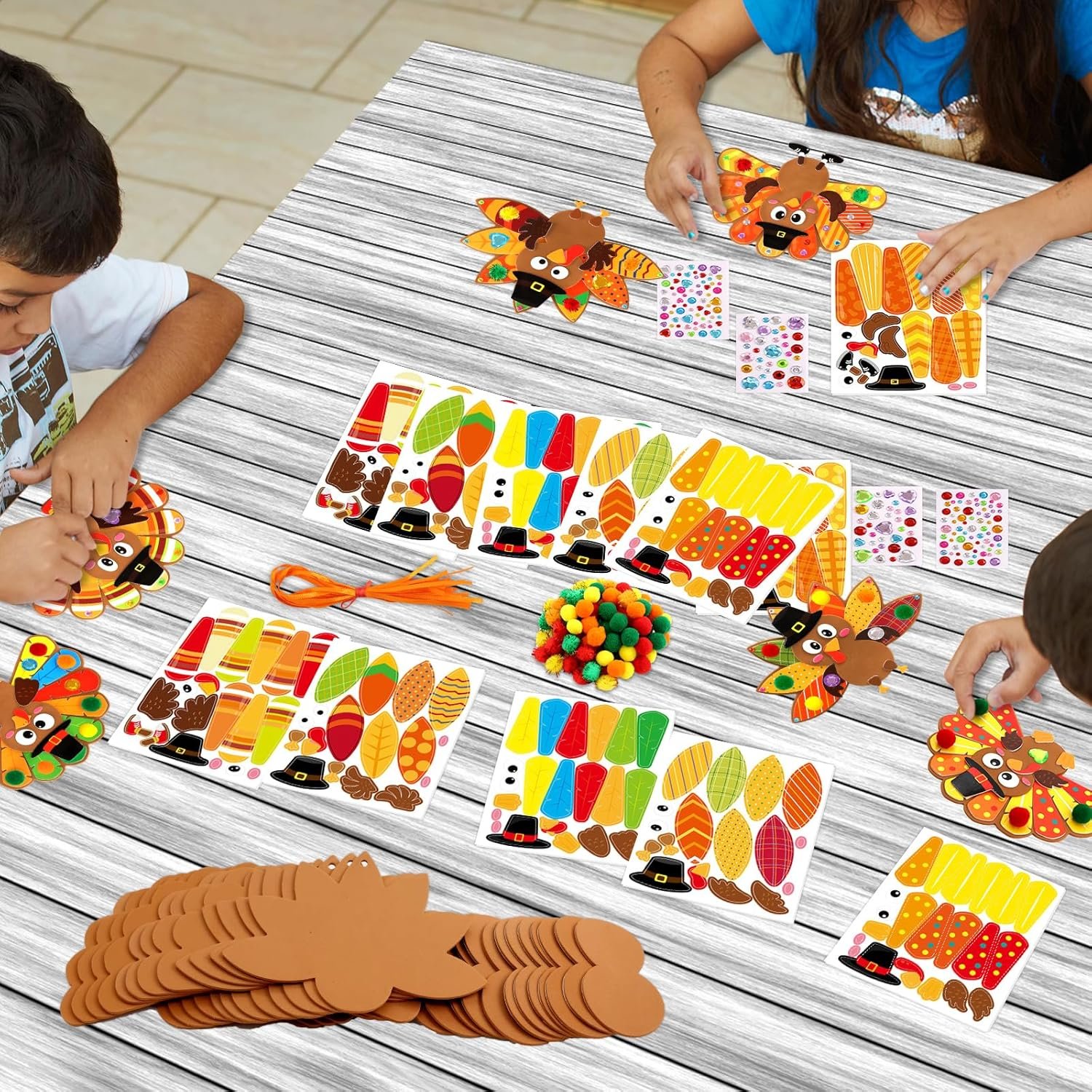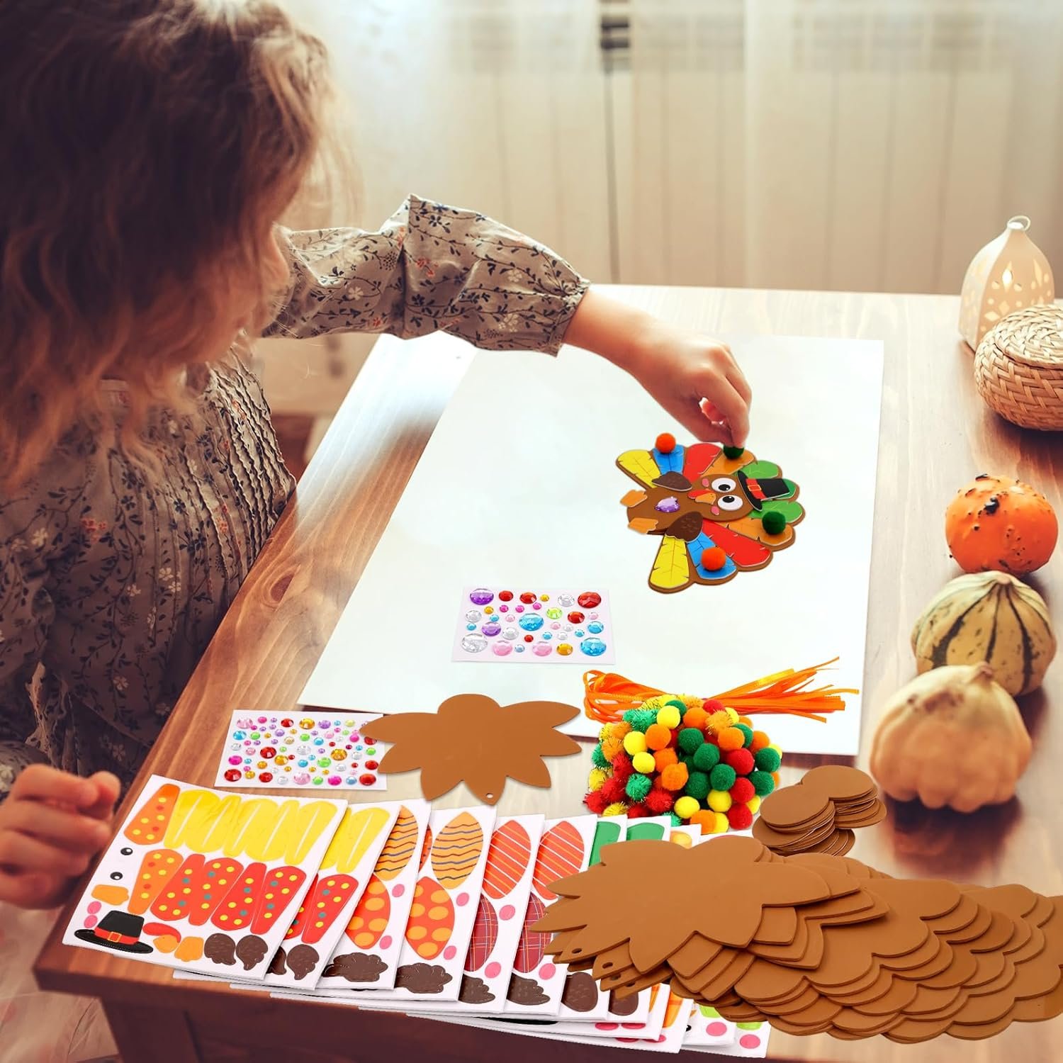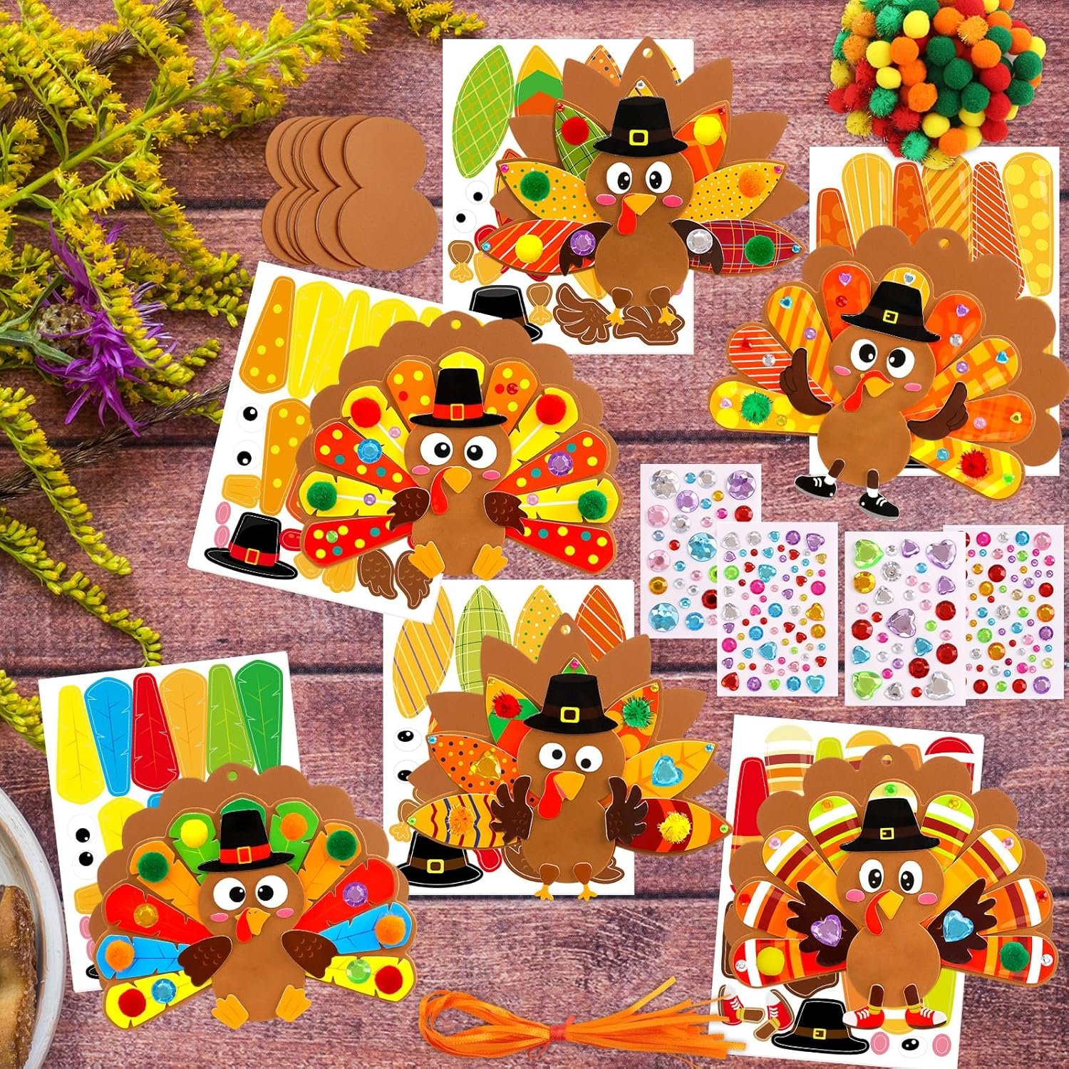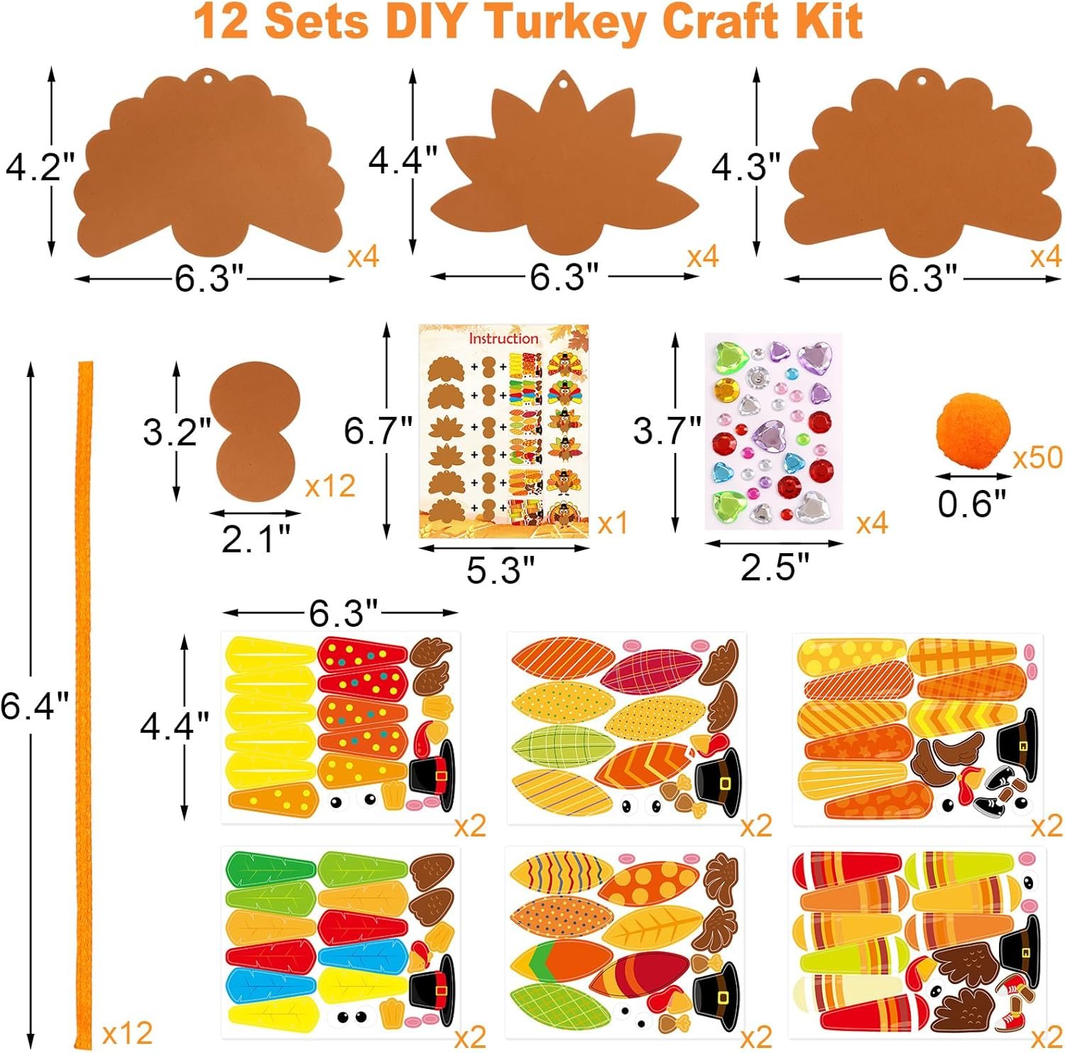 Package Includes: 12 sets turkey ornament craft kits including foam turkey bodies and feather bases, sheet stickers, ribbons, diamond stickers, pom-poms and instruction