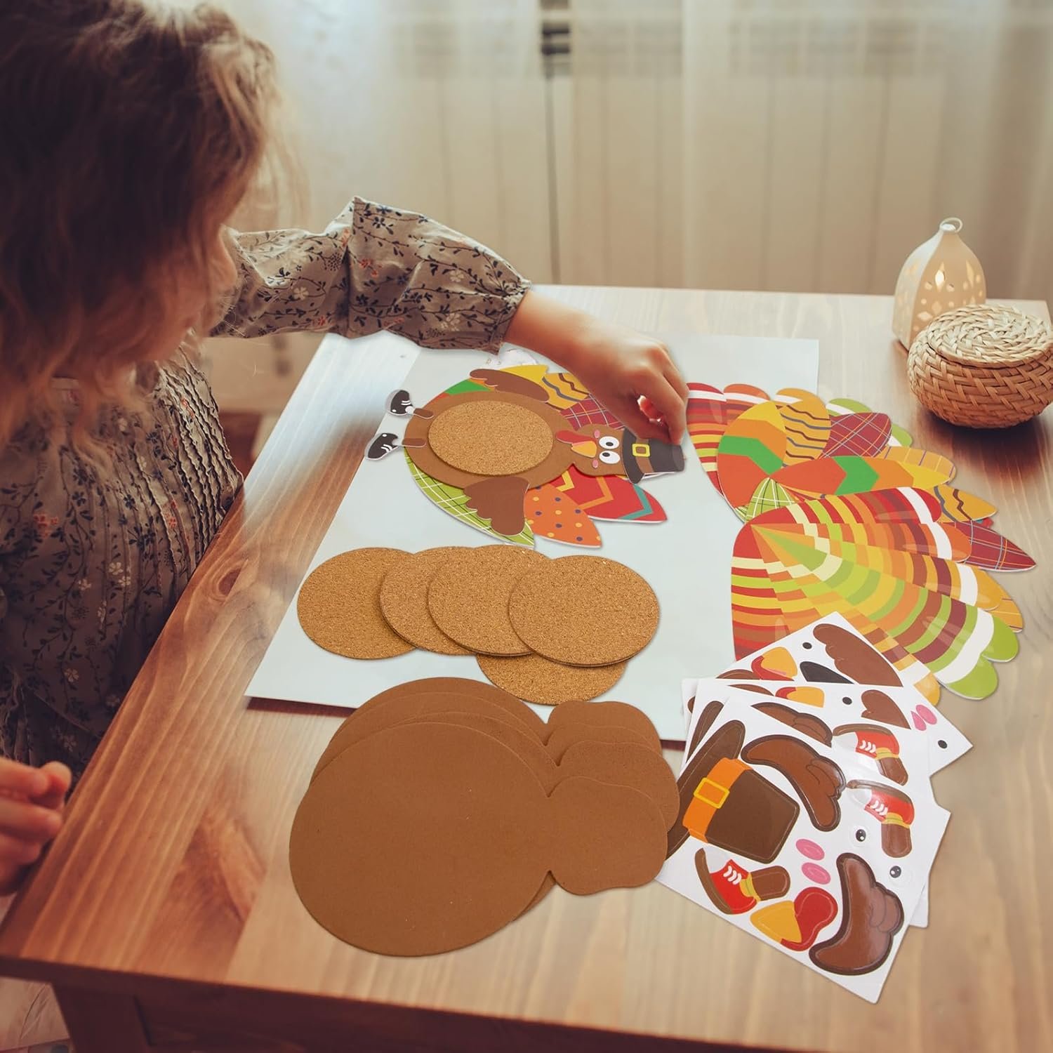 Package Includes: 6 make a turkey coaster craft sets. Each set has a turkey body, a feather background, a matched sticker sheet and a coaster
