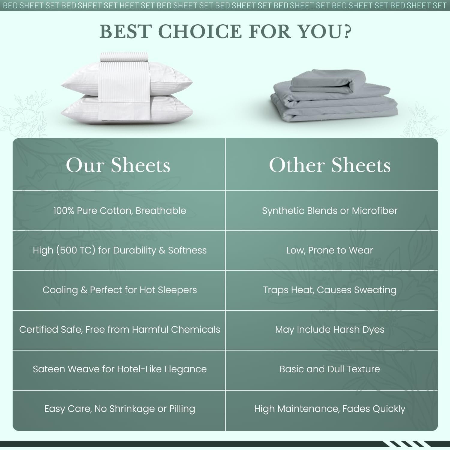 100% Premium Cotton Comfort : Crafted with a high 500 thread count from long-staple cotton, these sheets offer ultimate comfort and quality. The sateen weave provides exceptional durability and breathability, ideal for hot sleepers. The extra-long staple cotton yarns create a smooth, silky texture reminiscent of luxury hotel bedding. Mercerization enhances sheen, deepens color, and helps prevent fading and pilling, ensuring long-lasting beauty and comfort wash after wash.