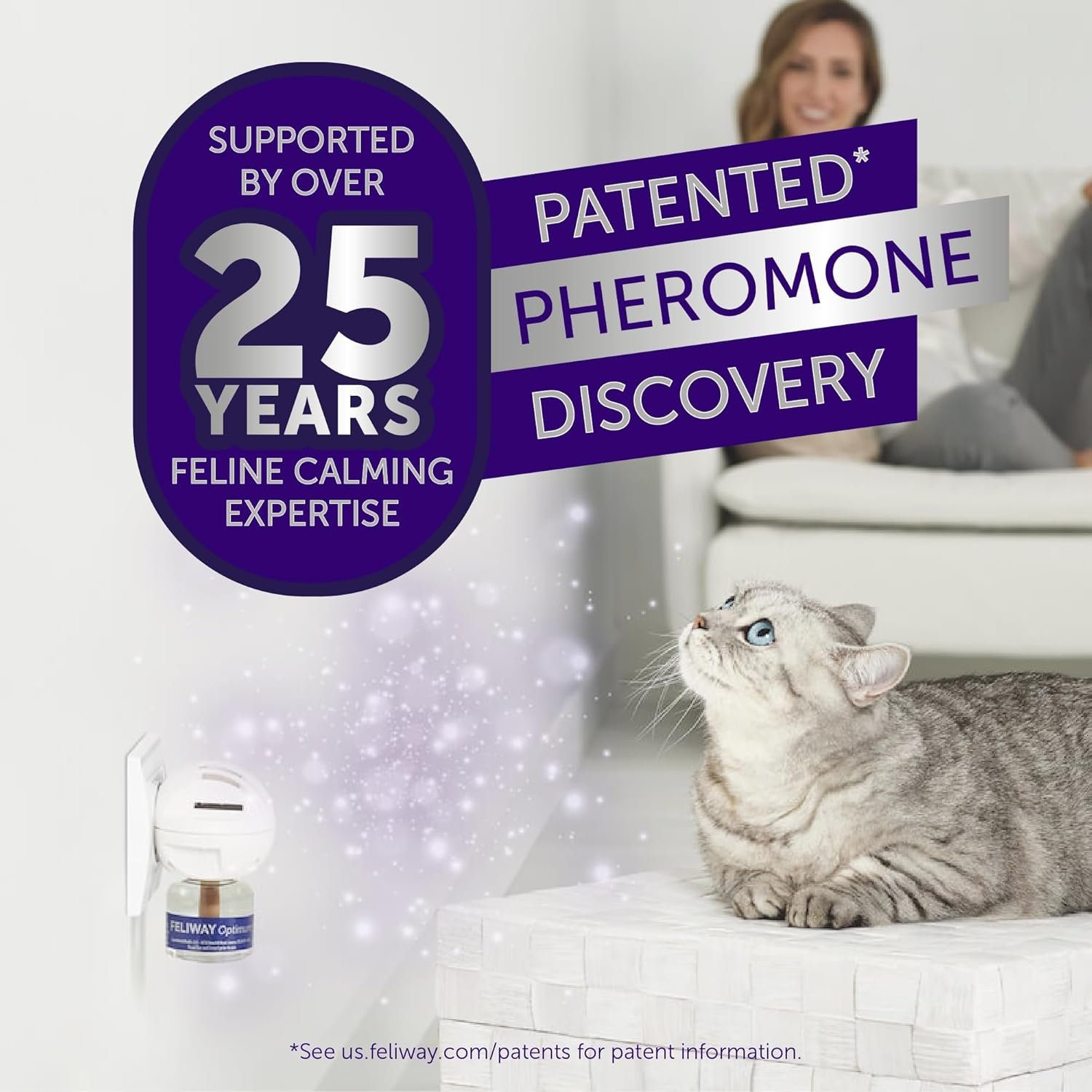 FELIWAY Optimum is a patented* pheromone discovery developed by the #1 vet recommended brand to help reduce common signs of stress in cats such as: scratching, urine spraying, conflicts between cats, and excessive hiding.