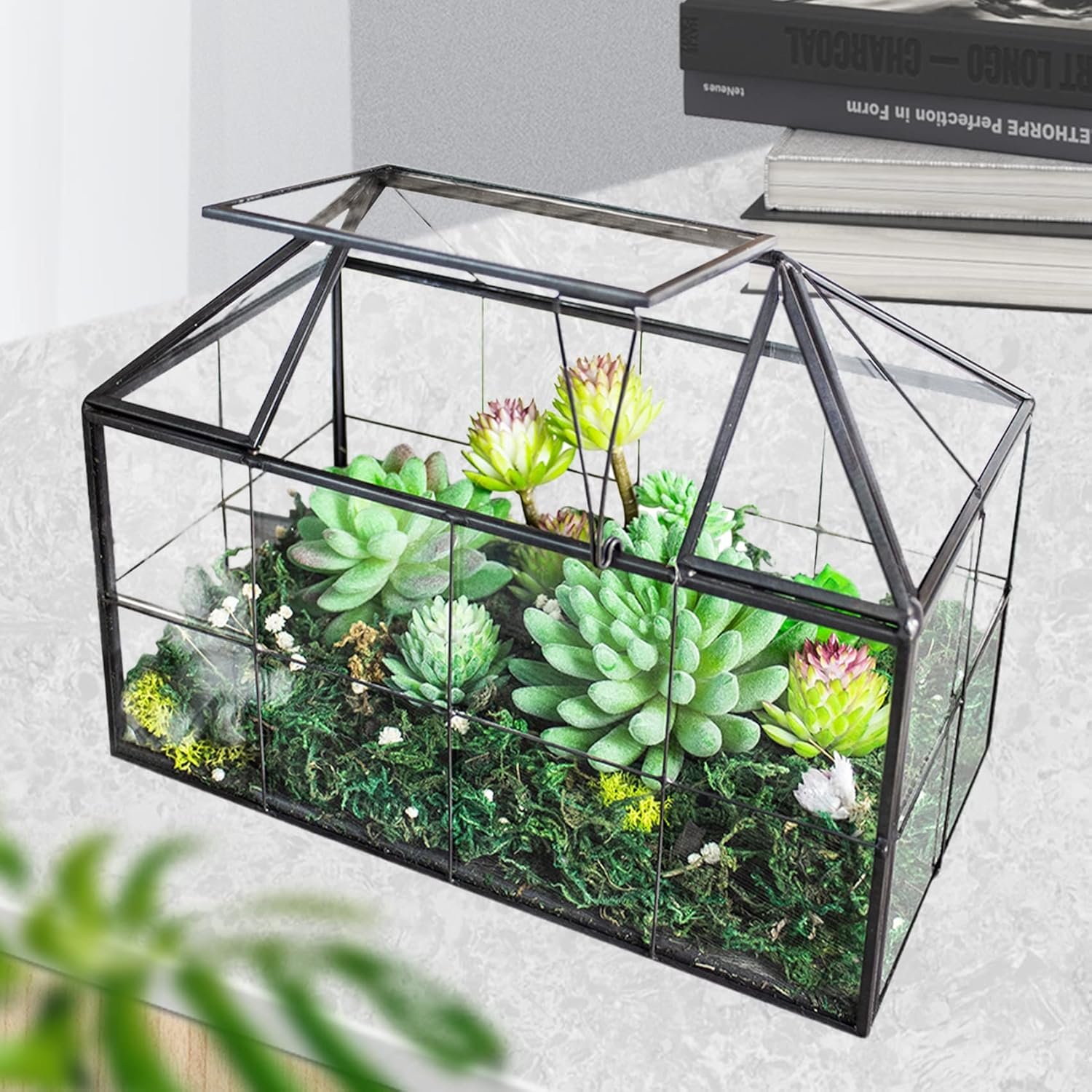 【Unique Design】This little terrarium is delicate in appearance and relatively well made, . It comes in house shape with a swing lid, which you can keep it open and definitely has enough oxygen flow through the little roof. Gorgeous terrariums full of mini-plants including succulents, ferns, moss and more!