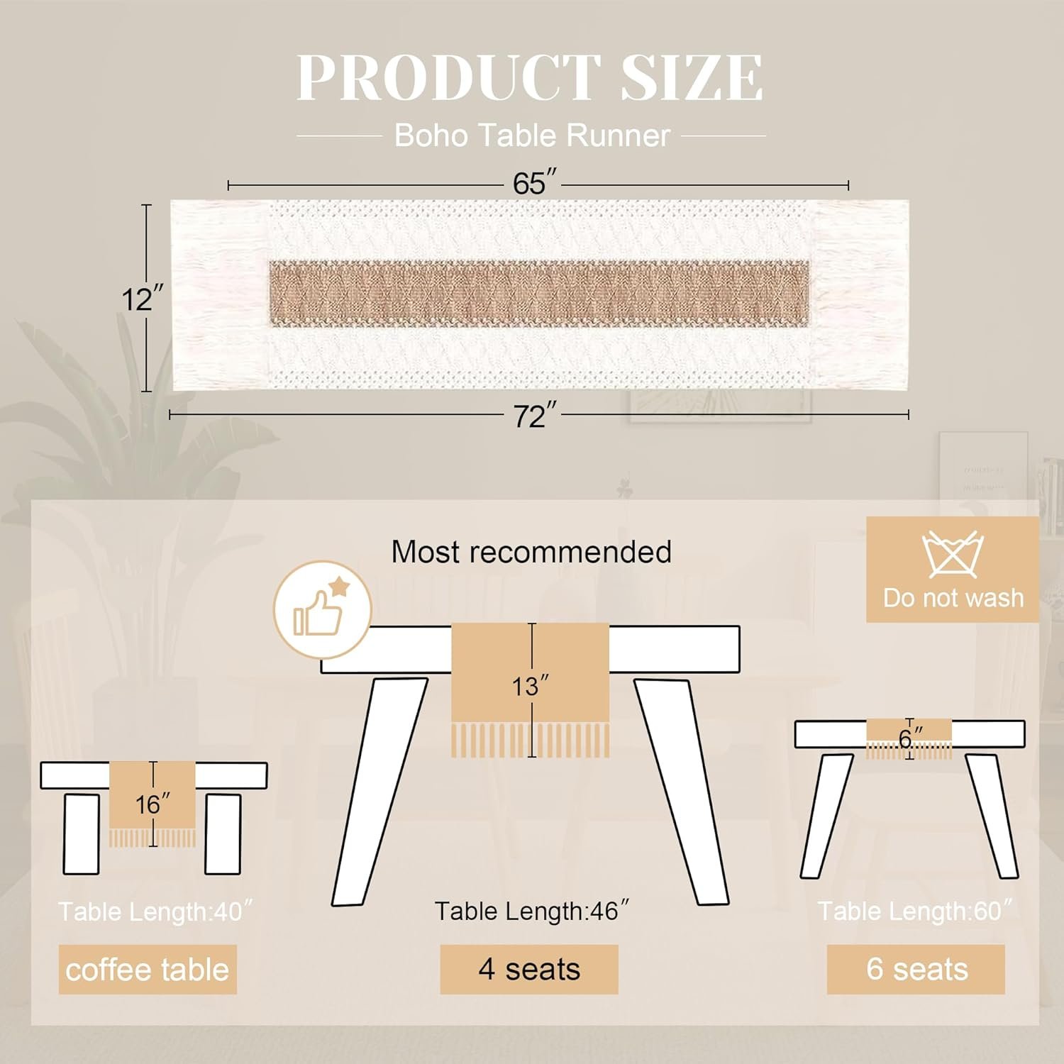 [Perfect 72 Inches Long]: Our macrame table runner with tassels measures 12 x 72inch, fits a dining table that seats 4-8 people. It can give your tables a rustic and boho look. (Because it is folded in the bag, when you take it out, the table runner will have creases, which will affect your measurement. So, please make sure the table runner is placed neatly and flat before measuring.)