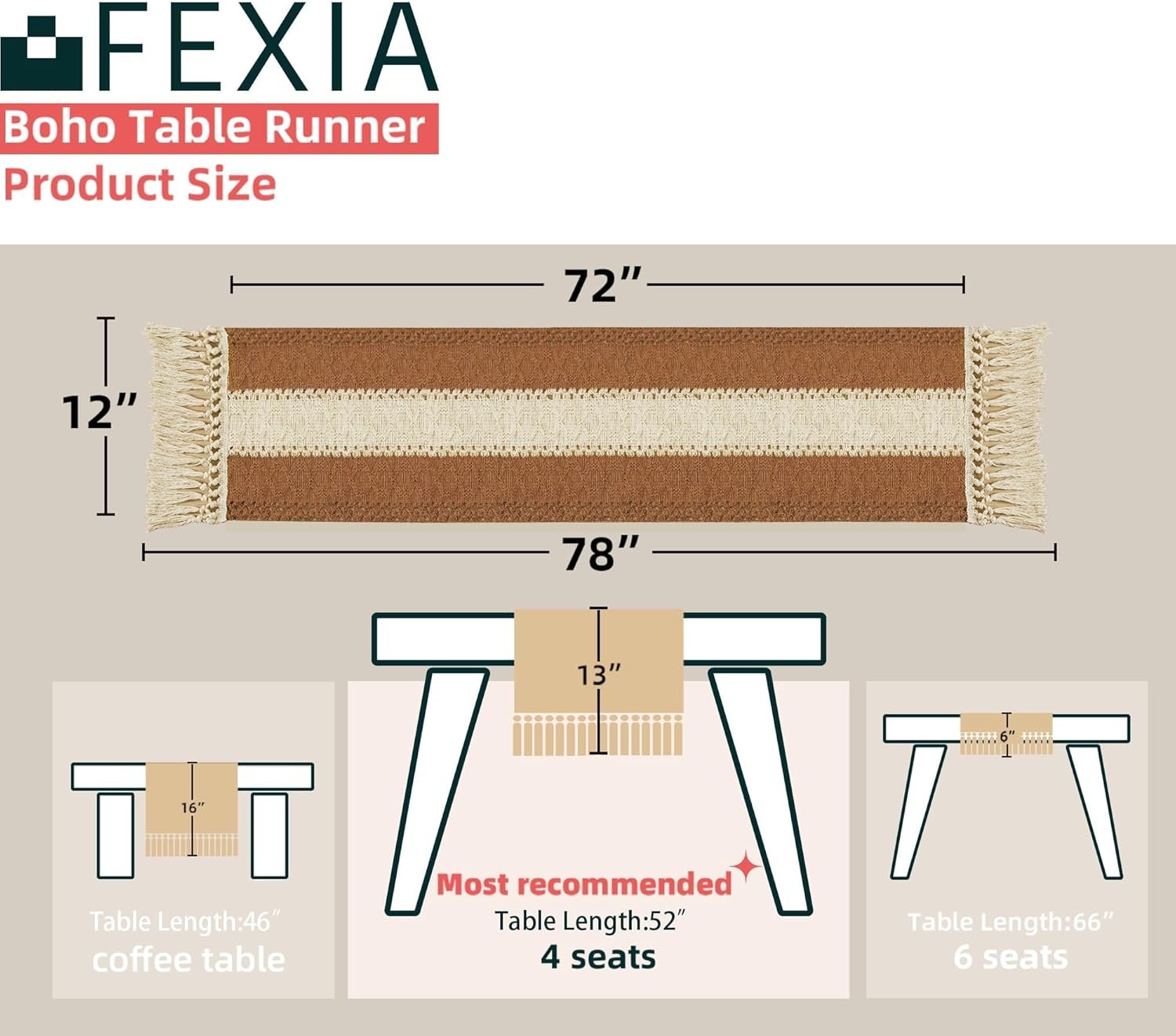 [Perfect 72 Inches Long] Our macrame table runner with tassels measures 12 x 72inch, fits a dining table that seats 4-8 people. It can give your tables a rustic and boho look. (Because it is folded in the bag, when you take it out, the table runner will have creases, which will affect your measurement. So, please make sure the table runner is placed neatly and flat before measuring)
