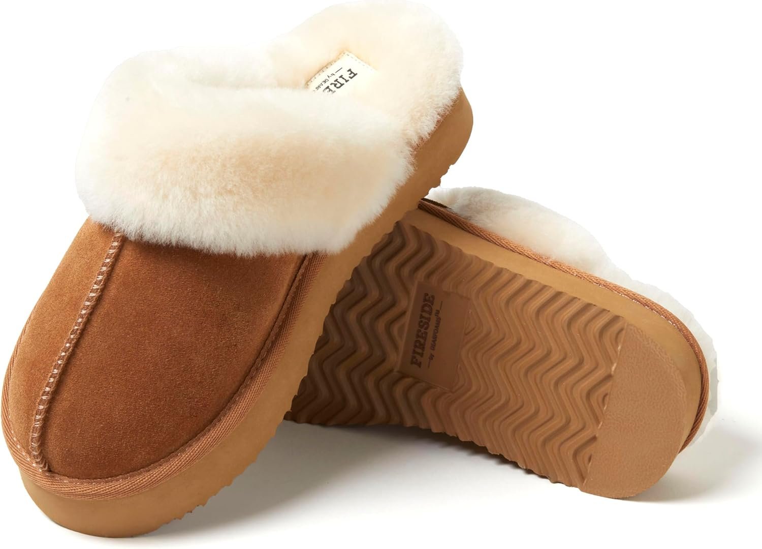 Fireside By Dearfoams Women’s Melton Platform Slippers, Genuine Shearling Memory Foam Slip-in House Shoes