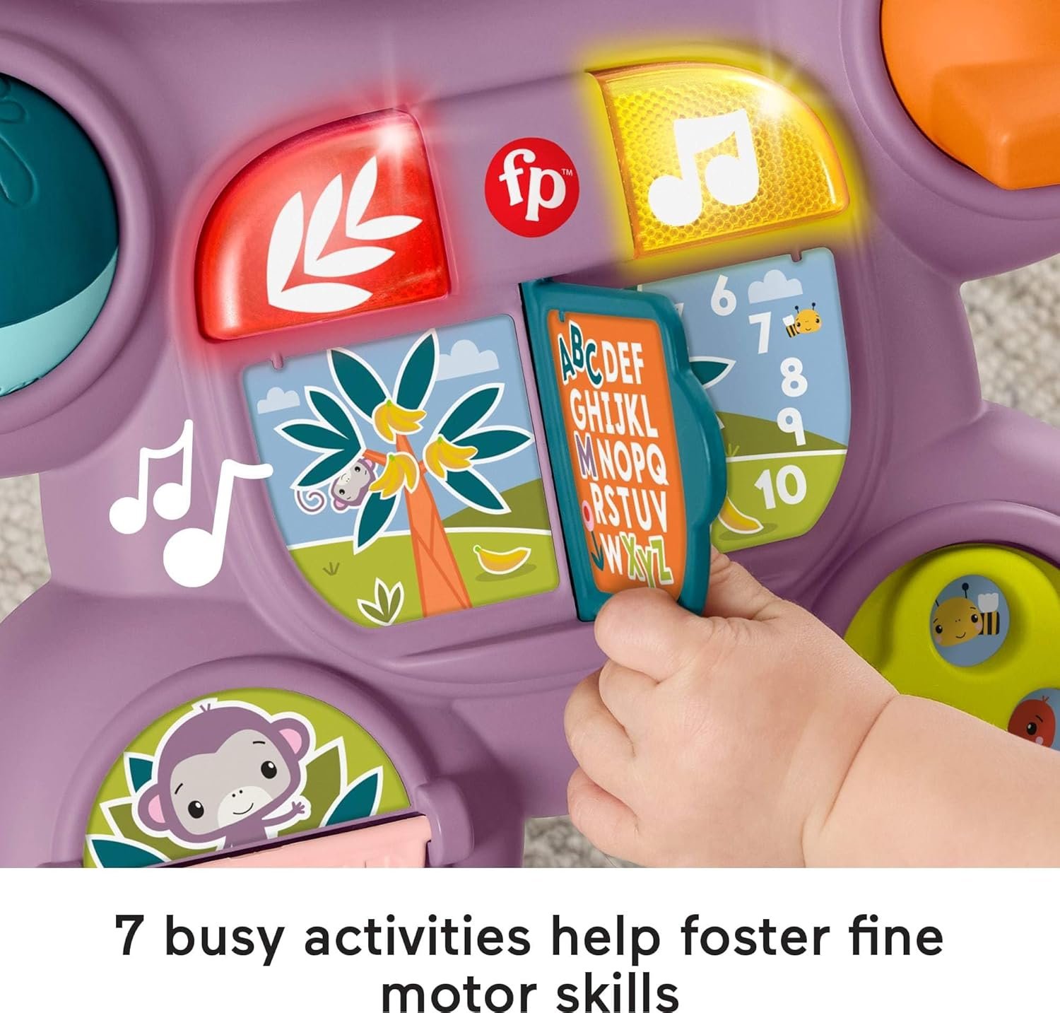 7 busy activities to explore! Light-up buttons, flip book, rollerball, flipper, spinner, and toggle switch​