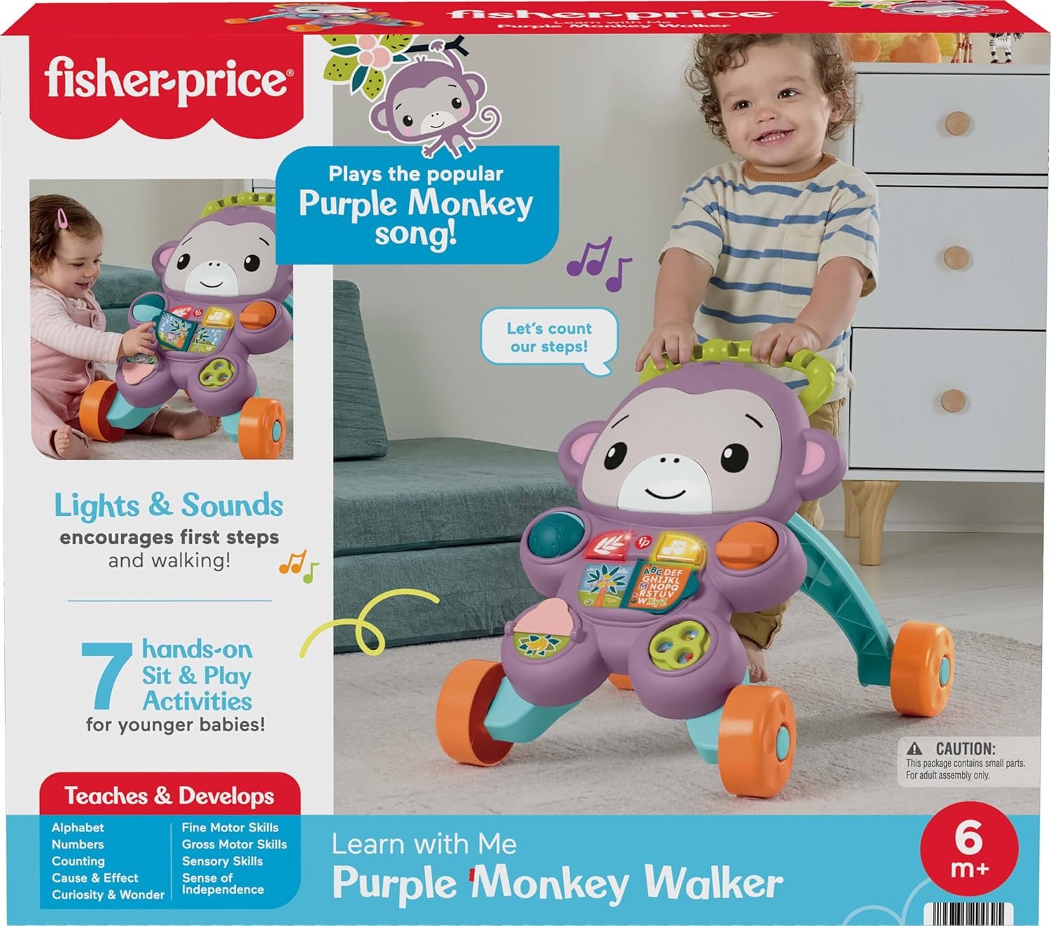 Plays the popular Purple Monkey “Maybe” song! Rewarding music and sounds encourage baby to keep walking and pushing along