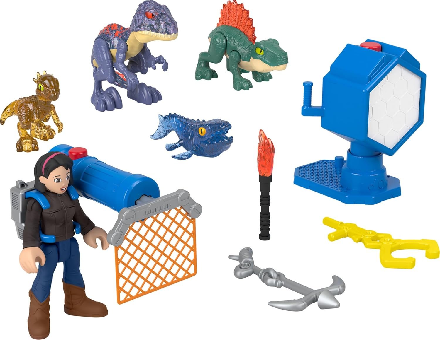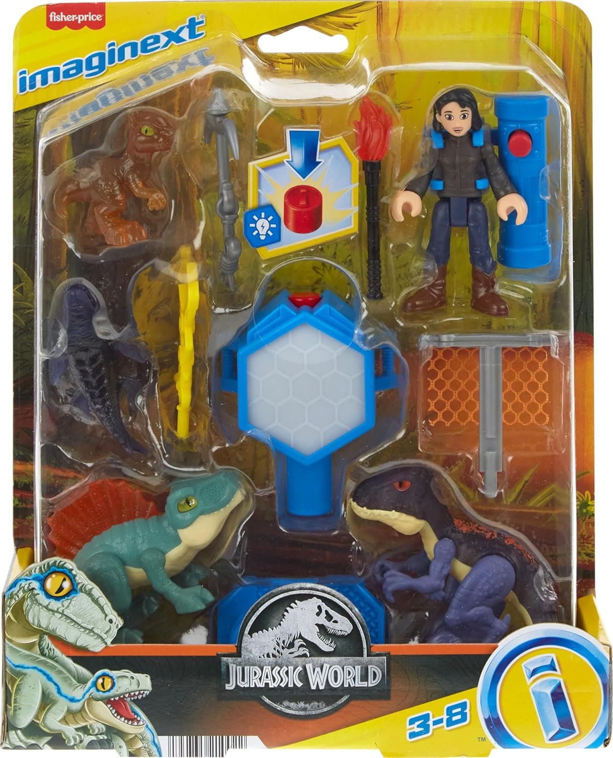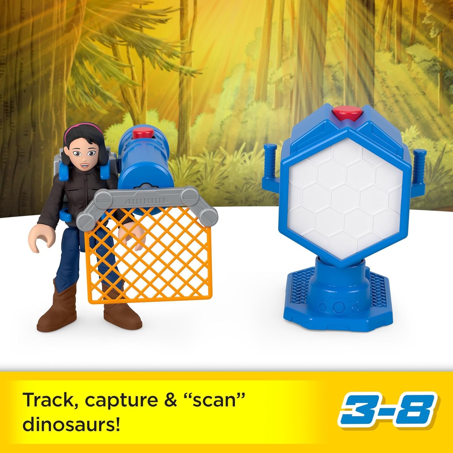 Playset includes poseable character figure, 4 dinosaurs with translucent features, 1 scanner, 1 launcher with projectile, and 3 play pieces
