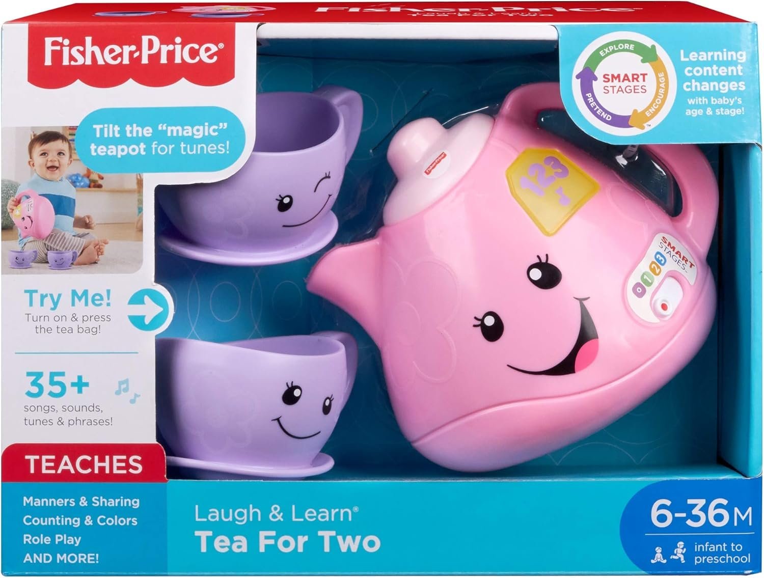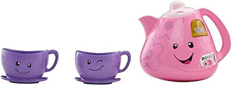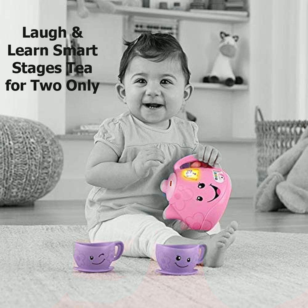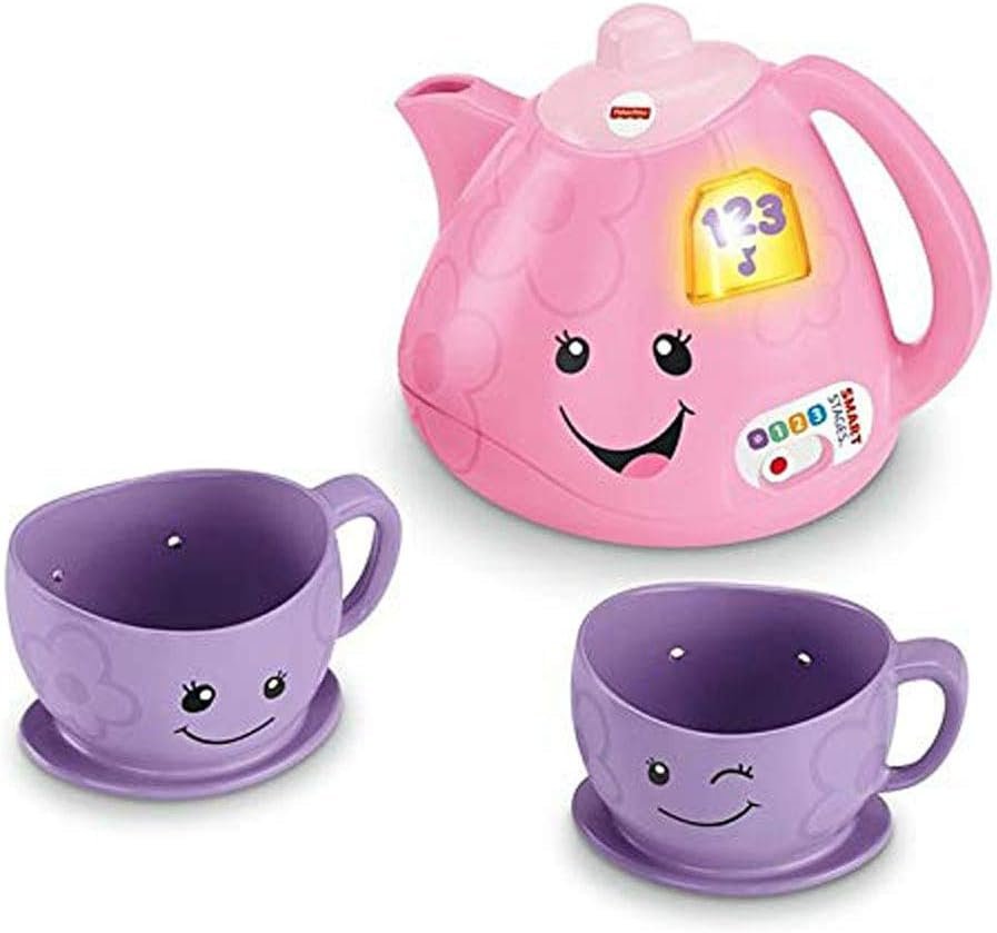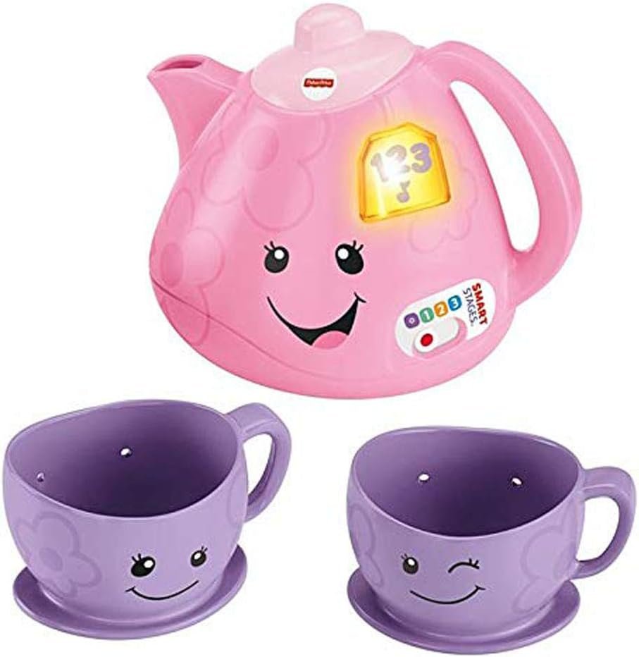 Product Features This adorable tea set with interactive teapot introduces your baby to sharing, manners, greetings, and more with fun songs and sounds! Two for tea, and tea for two! This Laugh & Learn tea set from Fisher-Price introduces the delights of pretend play while helping your baby learn about sharing, manners, colors, and more! Tilt the “magic” teapot and hear the musical learning fun pour out! Plus, with Smart Stages technology, you can choose the learning level that best fits your tea-party tot. Where development comes into play Academics: Playful songs, sounds, and phrases introduce sharing, counting, manners, colors, greetings, and more. Curiosity & Wonder: Tilting the teapot and pressing the teabag button to activate the songs and sounds introduces your baby to cause and effect. Creativity & Imagination: The familiar tea set design encourages early role play and imaginative fun as your little one enjoys a pretend tea party with you! Tilt the “magic” teapot or press the teabag button for fun songs & sounds! Learning content changes with baby’s age & stage with Smart Stages technology Fresh songs, phrases and sounds introduce sharing, counting, manners, colors, greetings, and more! Includes interactive teapot and 2 teacups SKU #: FWP38