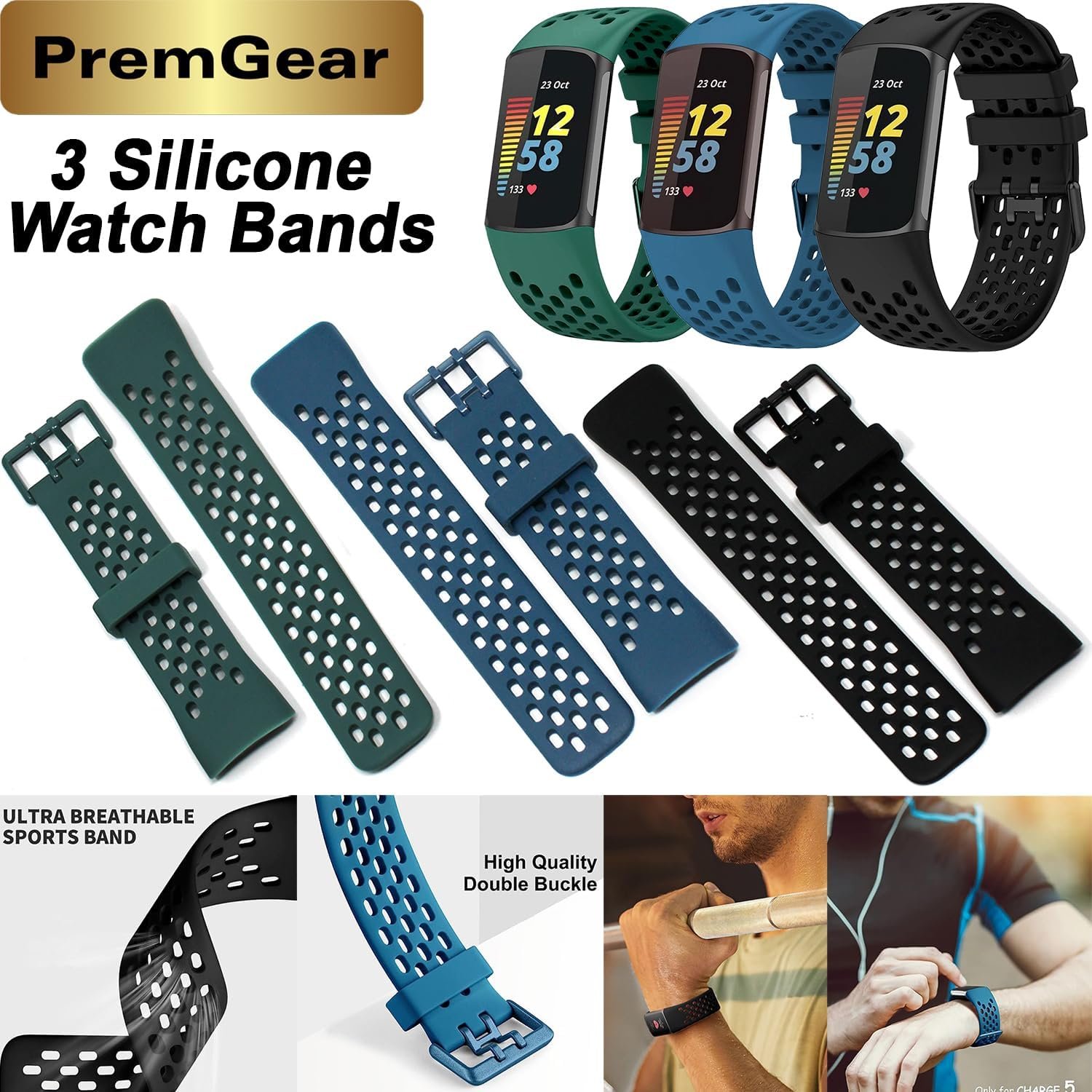 * PremGear 3 Silcone Breathable Extremly Lightweight and Comfortable Watch Bands (Black, Blue, Green)