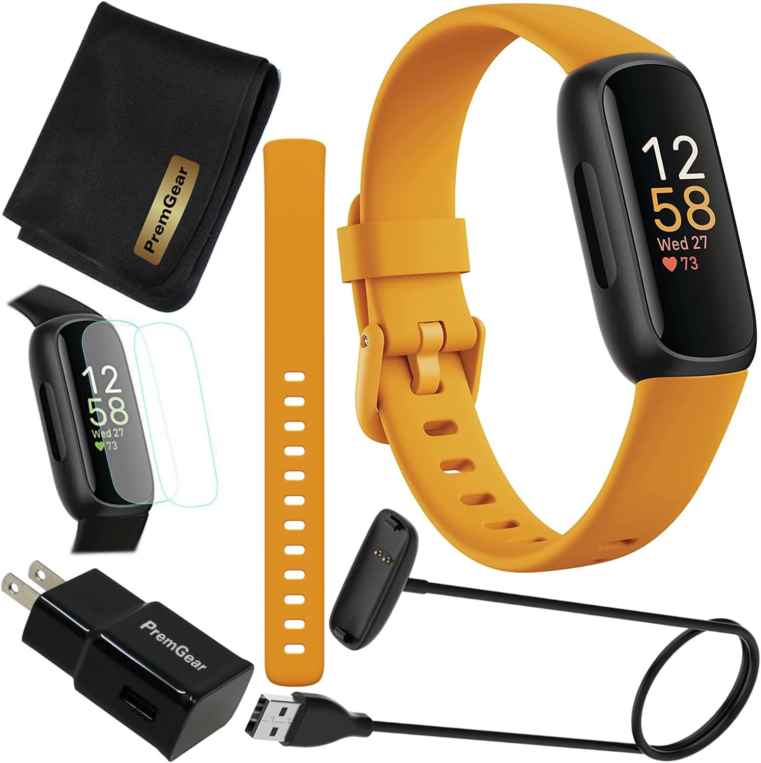 This Exciting Bundle/Kit Includes: Fitbit Inspire 3 Health & Fitness Activity Tracker (Morning Glow / Black), Small & Large Bands, PremGear 3.3ft USB Charging Cable, PremGear Wall Adapter, 2 PremGear Screen Protectors & PremGear Quality Cleaning Cloth
