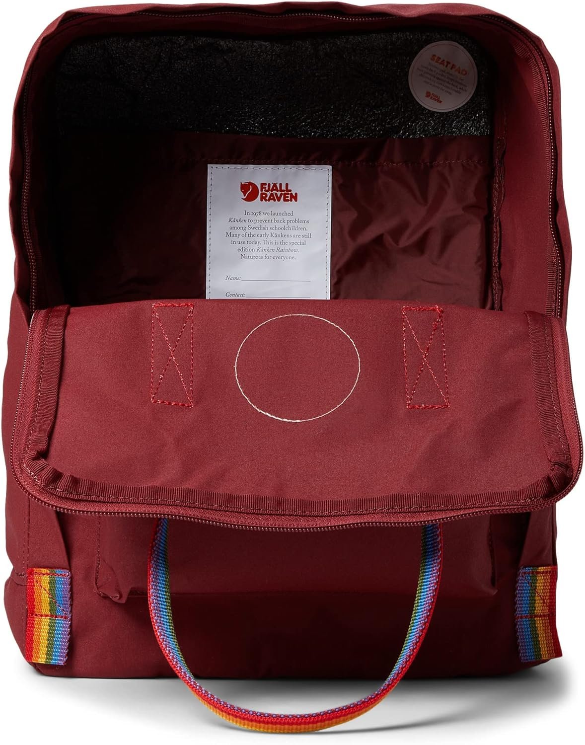 Stylish and Durable: Made from lightweight, showerproof Vinylon F material, this backpack features a rainbow patterned shoulder strap and a Fjällräven logo patch on the front.