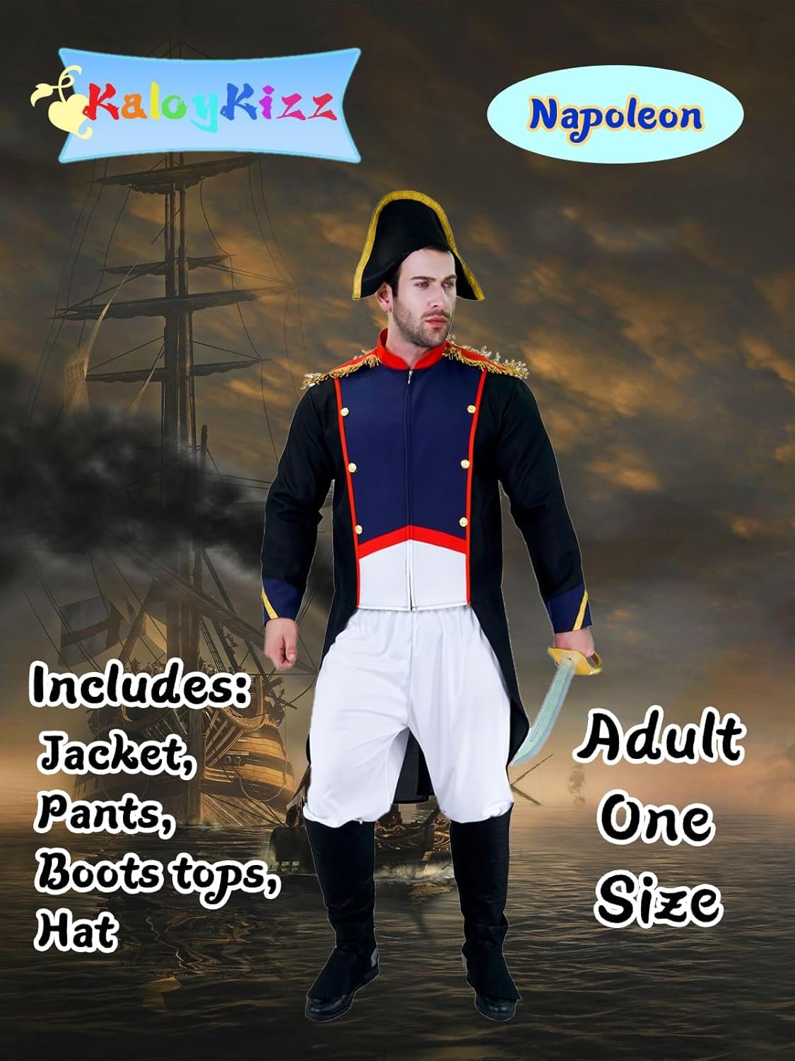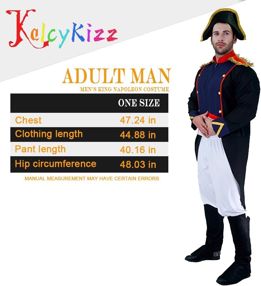 Men’s King Napoleon Costume includes:Jacket,Pants, Boots tops,Hat