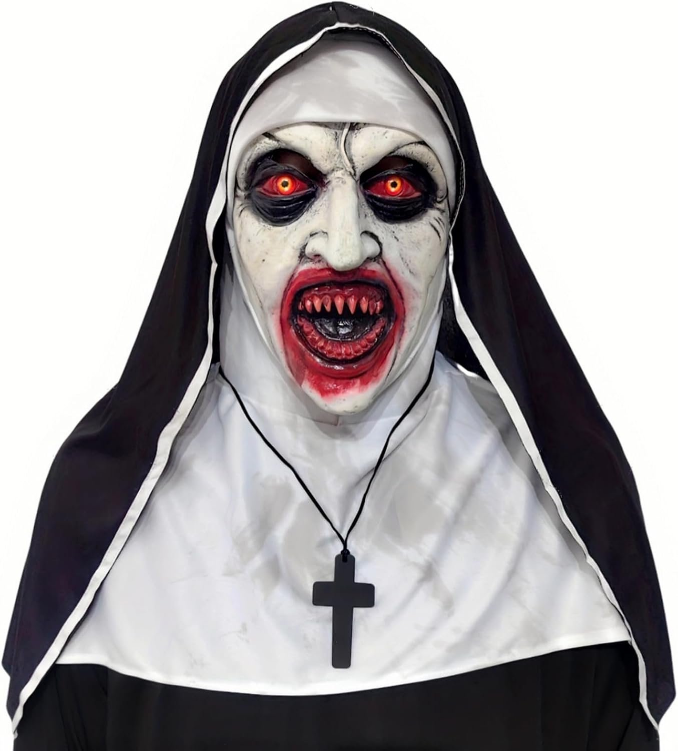 The full-head latex nun mask is made from 100% natural latex. It completely covers your head for enhanced realism and is flexible for easy wear.
