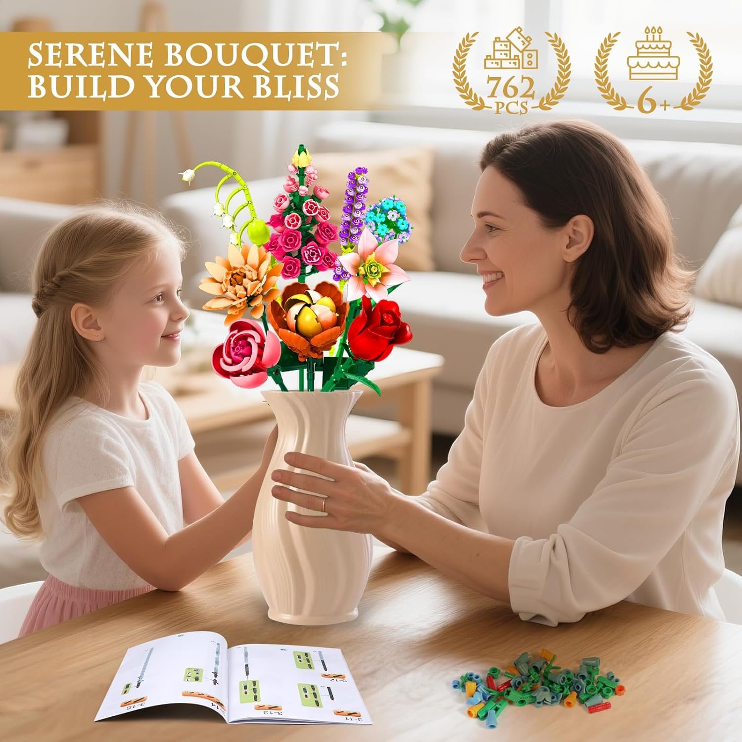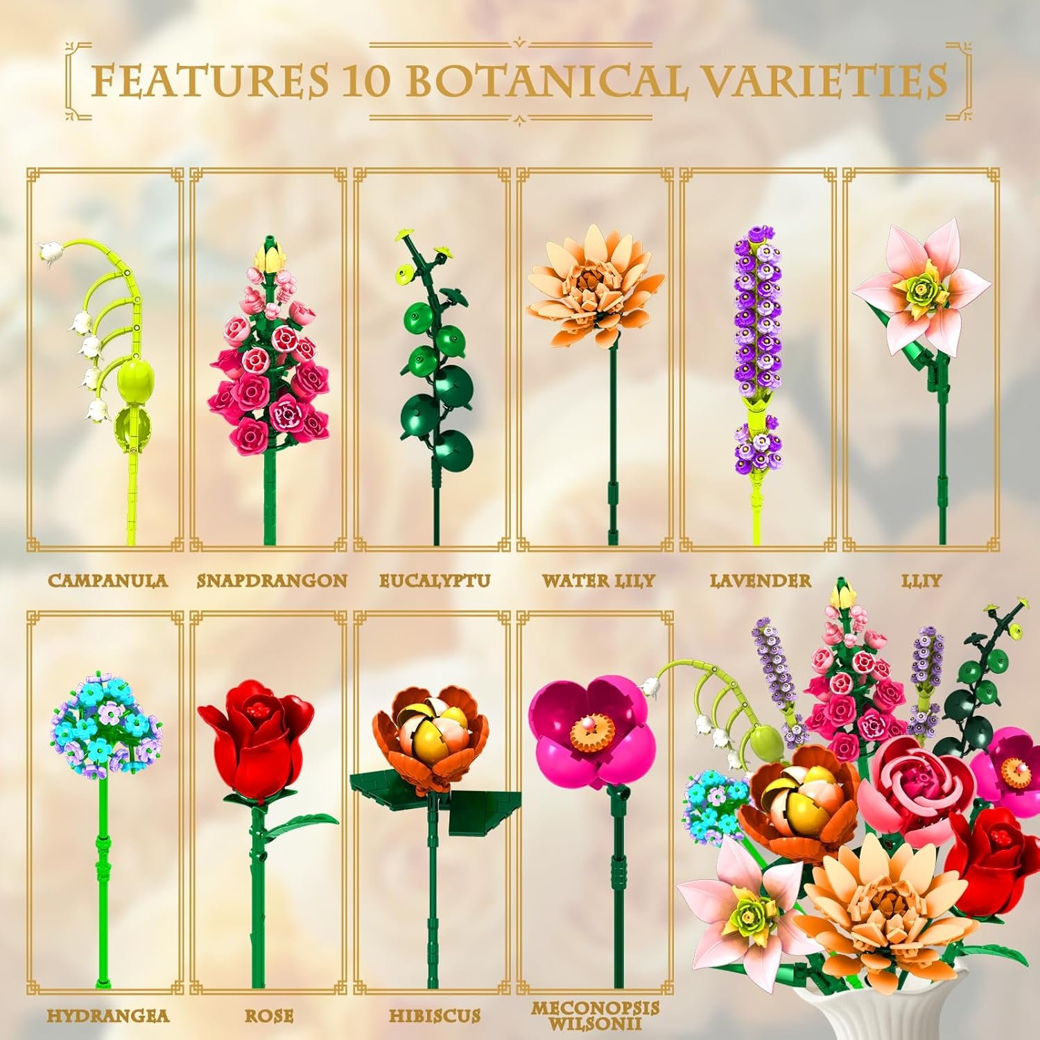 762 PCS for Customizable Creative Arrangement:Comes with 762 premium building blocks to assemble multiple unique floral types and greenery. The extensive piece count allows for detailed customization, so you can craft a one-of-a-kind floral display that matches your style.